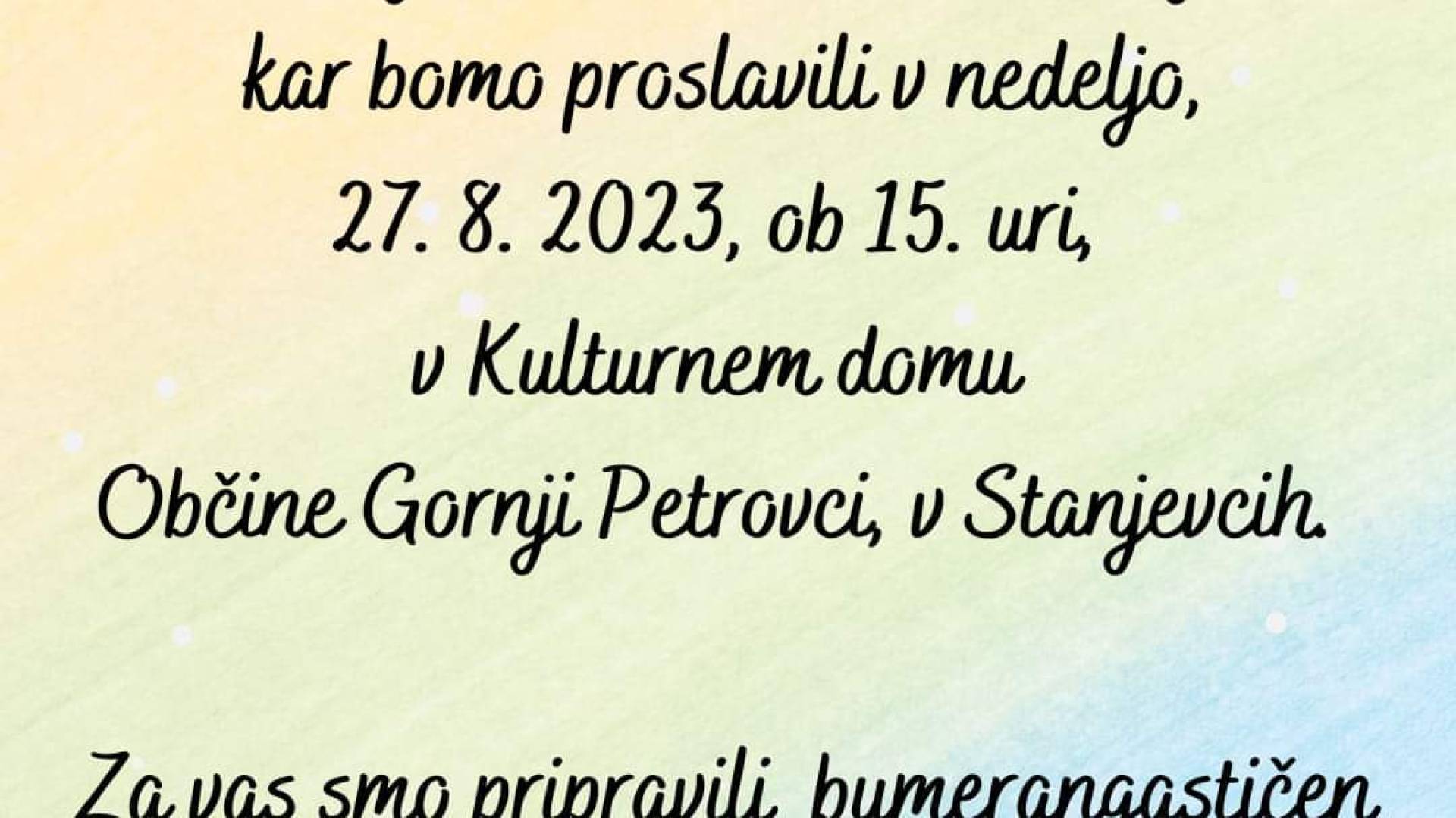 Kulturni dom StanjevciDruštvo Bumerang Sreče vas vabi na prireditev ob 10. obletnici delovanja društva, ki bo v nedeljo, 27. 8. 2023 ob 15. uri, v Kulturnem domu v Stanjevcih.