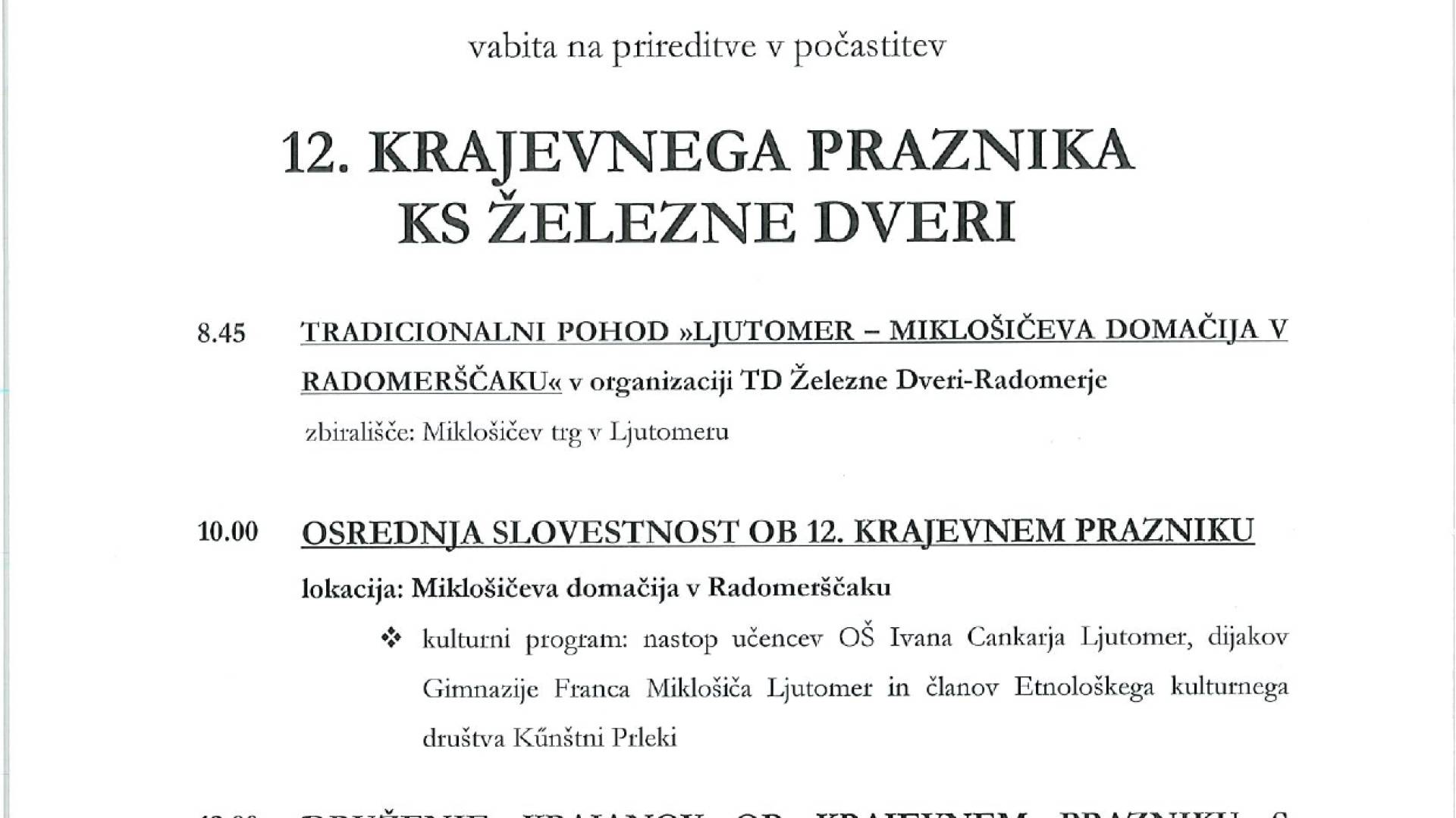 12. krajevni praznik KS Železne dveri Jana Bohar | 5. junij 2023 11:59 v Termin Sobota, 10. junij 2023 8:45 Lokacija Različne lokacije Vabljeni!