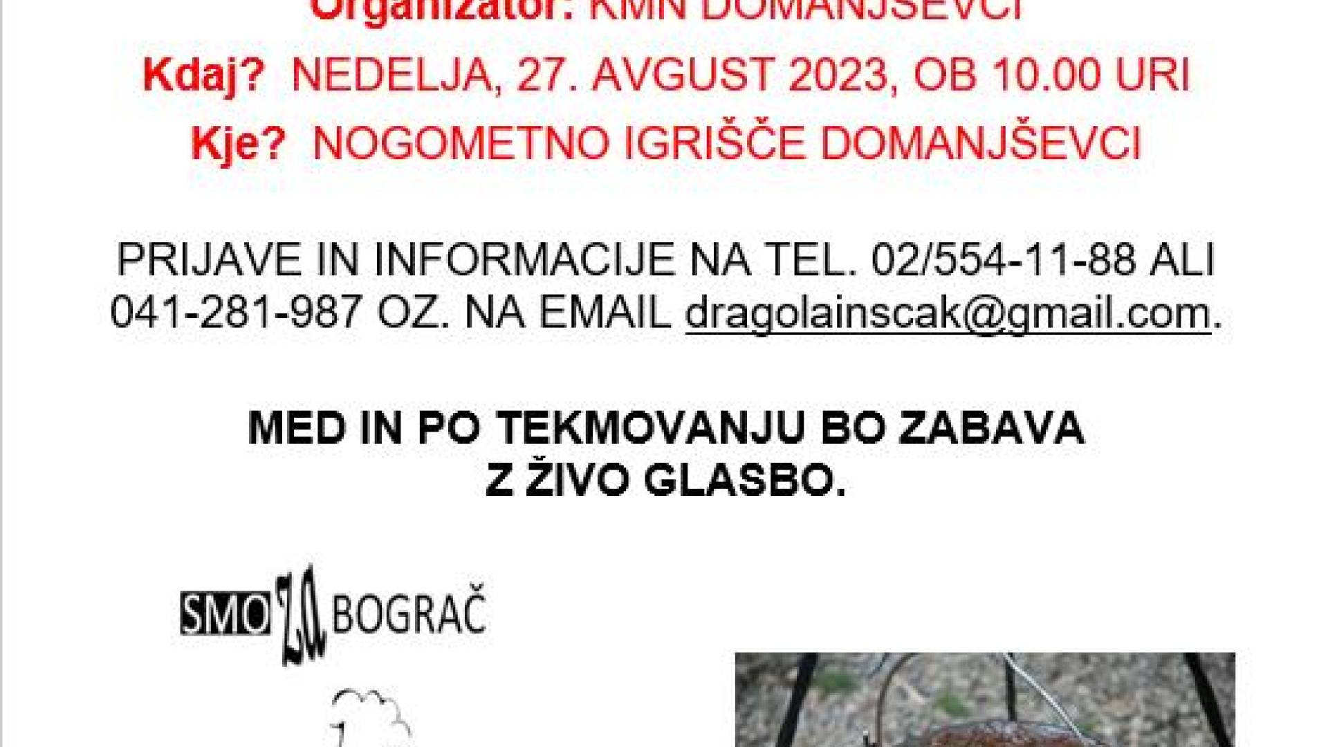 14. Tekmovanje v kuhanju goričkega bograča Jana Bohar | 24. avgust 2023 09:59 v Termin Nedelja, 27. avgust 2023 10:00 Lokacija Domanjševci Vabljeni!