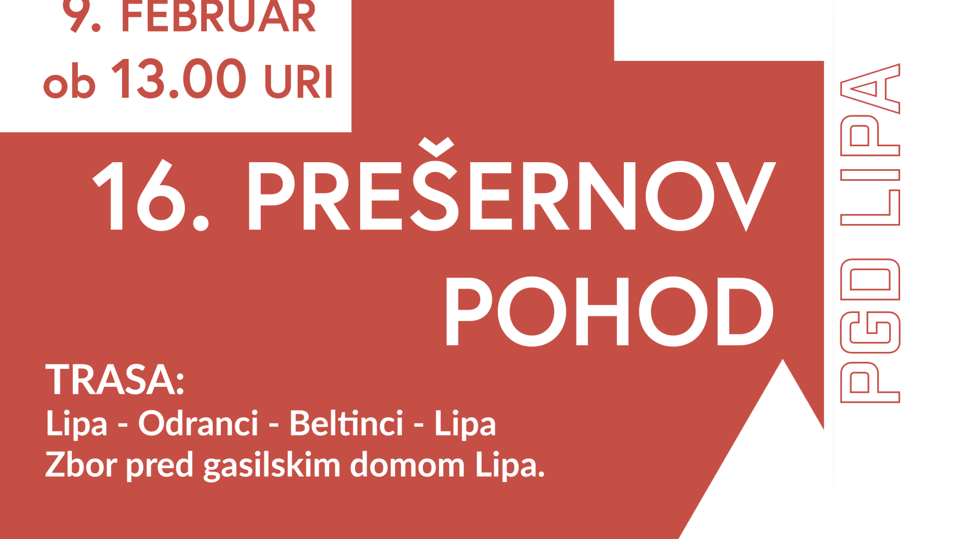 Gasilski dom LipaV nedeljo, 09.02.2025, vas ob 13. uri vabimo na 16. Prešernov pohod v organizaciji Prostovoljnega gasilskega društva Lipa.