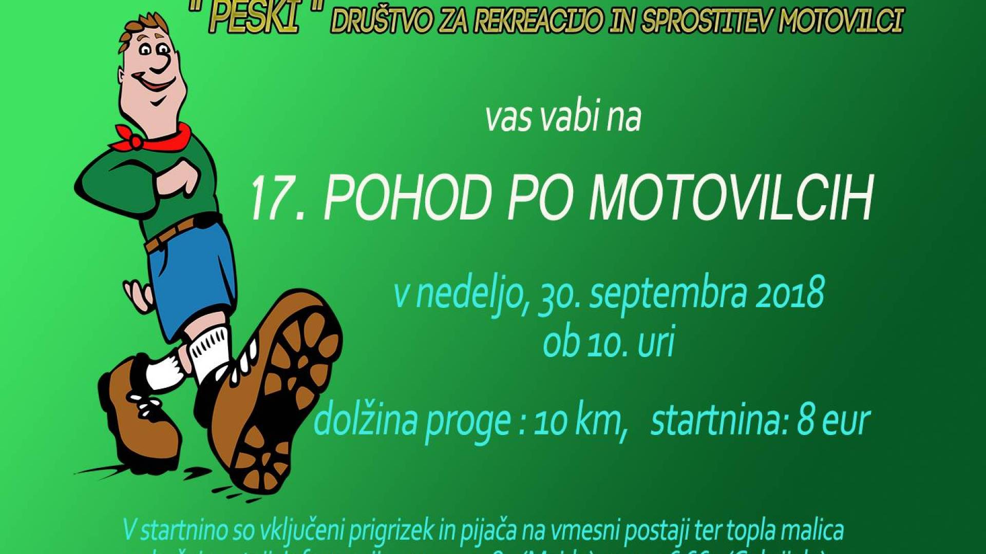 MotovilciDruštvo za rekreacijo in sprostitev Motovilci "Peški" vas vabi na 17. Pohod po Motovilcih, ki bo potekal v nedeljo, 30. septembra 2018 ob 10. uri.