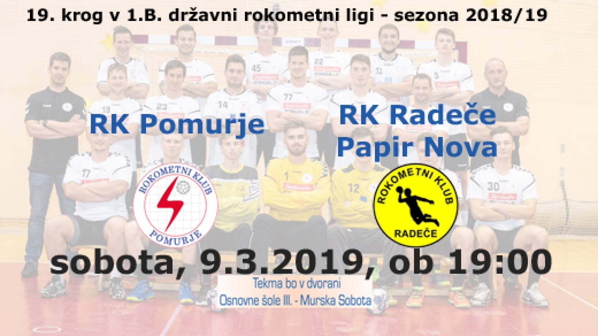 Športna dvorana OŠ III, Murska SobotaRokometaši Pomurja se bodo v 19. krogu 1.B državne rokometne lige za moške pomerili proti 10. uvrščeni ekipi iz Radeč.