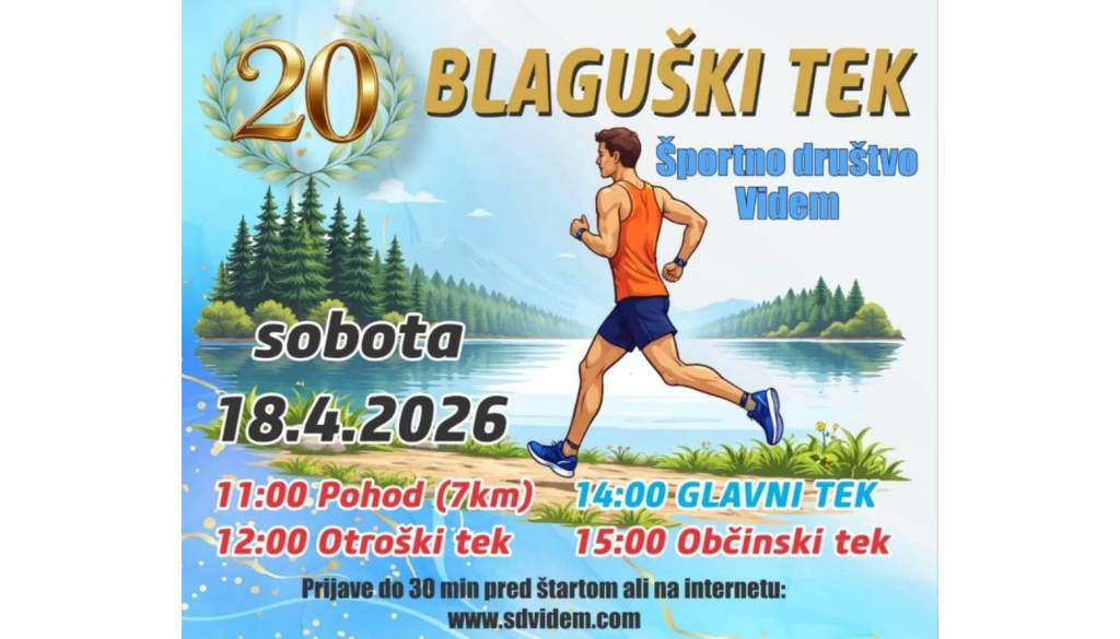 Blaguš, 9244 Sveti Jurij ob ŠčavniciŠportno društvo VIDEM organizira 18.4.2026 ob 11:00 uri 20. Blaguški tek, ki poteka tudi letos v okvirju ŠTAJERSKO-KOROŠKEGA POKALA v rekreativnih tekih.