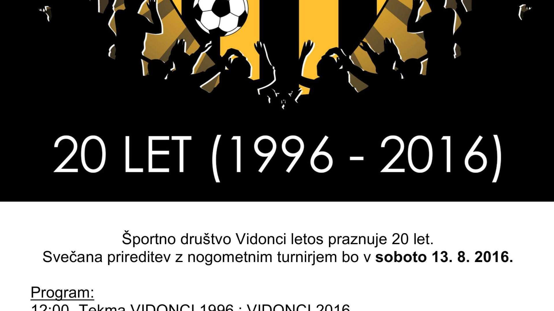 Športni center VidonciŠportno društvo VIDONCI letos praznujemo 20 let obstoja in delovanja. Jubilej bomo obeležili s športno-kulturno prireditvijo v soboto 13.8.2016 s pričetkom ob 12:00 uri v športnem centru Vidonci.