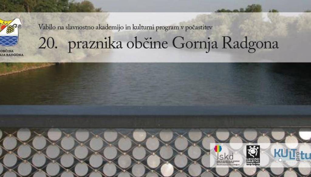 Dom kulture Gornja RadgonaVabljeni na osrednjo proslavo ob 20. prazniku občine Gornja Radgona, ki bo v četrtek, 1. oktobra 2015. Prireditev v Domu kulture Gornja Radgona se bo začela ob 17. uri z odprtjem likovne razstave Milene Marije Reščič v galeriji in nadaljevala s svečano akademijo z bogatim kulturnim programom, ki ga bosta izvedla KD Harmonikarski orkester Gornja Radgona in Glasbena šola Gornja Radgona.