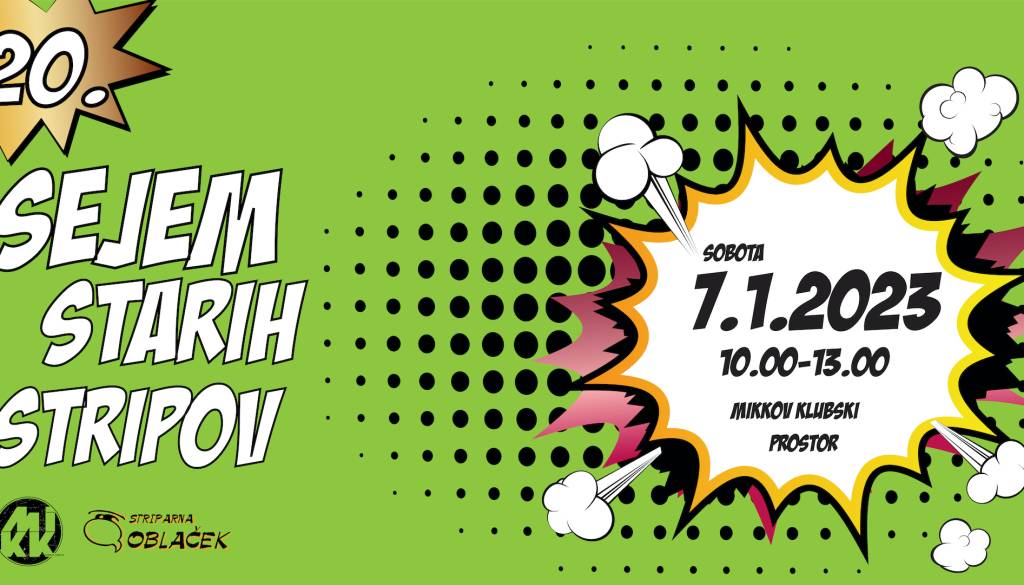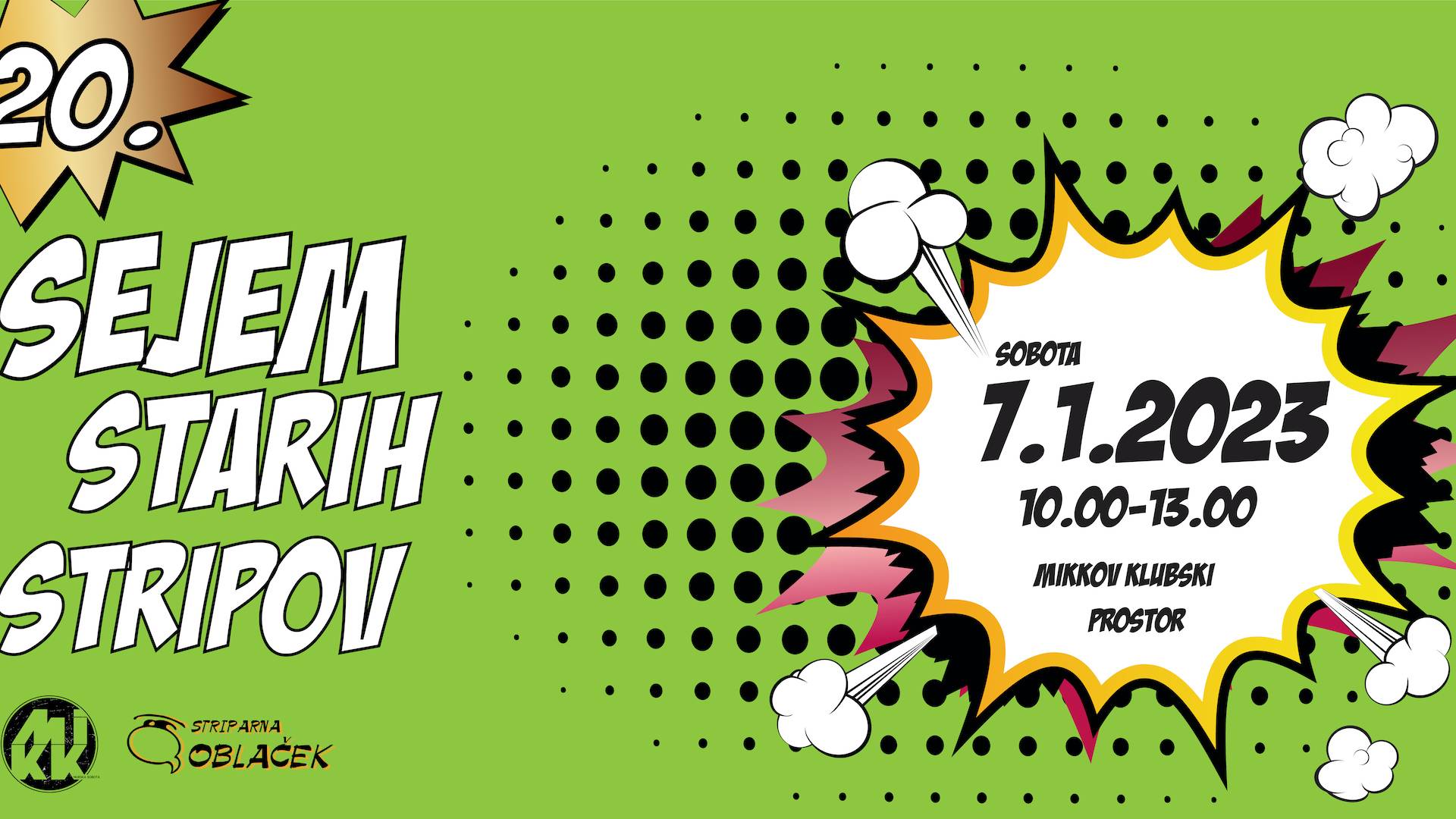 Že 20. sejem starih stripov bo potekal v soboto, 7. januarja 2023, med 10. in 13. uro v MIKKovem klubskem prostoru. Na dogodek ste vabljeni kot kupec ali ponudnik svojih starih stripov, lahko pa na dogodek pripeljete tudi svojo družino in samo zadovoljite svojo radovednost!