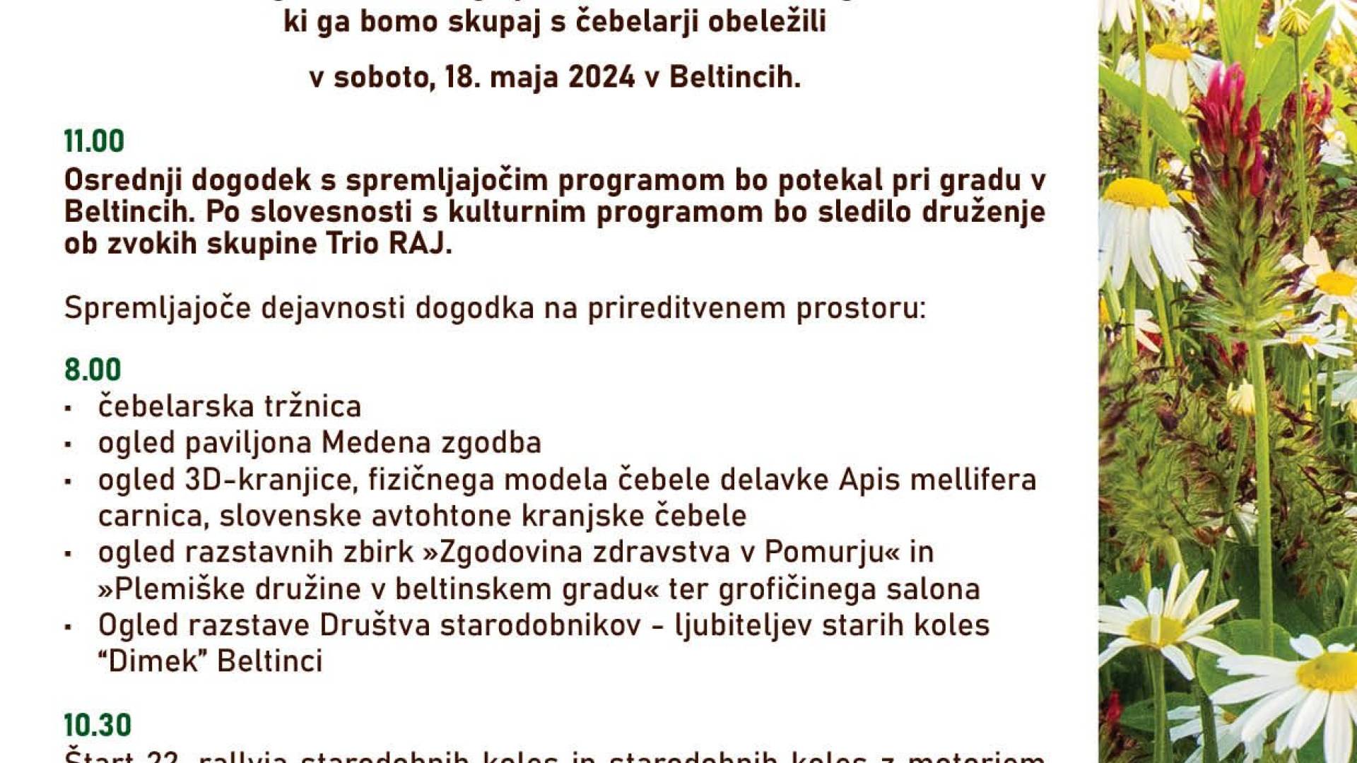 Beltinci, pri graduČebelarska zveza Slovenije v sodelovanju s Čebelarsko zvezo društev Pomurja in Občino Beltinci vabi na praznovanje 21. slovenskega čebelarskega praznika in 7. svetovnega dne čebel, ki ga bomo skupaj s čebelarji obeležili v soboto 18. maja 2024 v Beltincih.