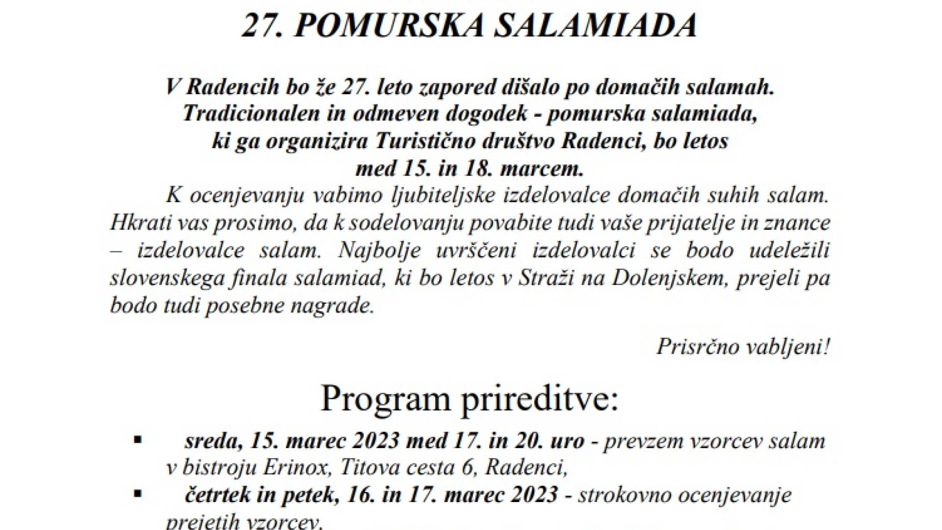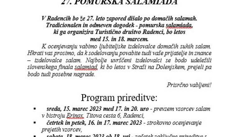 - sobota, 18. marec 2023 ob 18. uri - začetek zaključne prireditve s podelitvijo priznanj v restavraciji hotela Radin v Radencih. Poizkušali bomo ocenjene salame. Poskrbljeno bo za prijetno druženje ob glasbi ansambla ŠTRK.