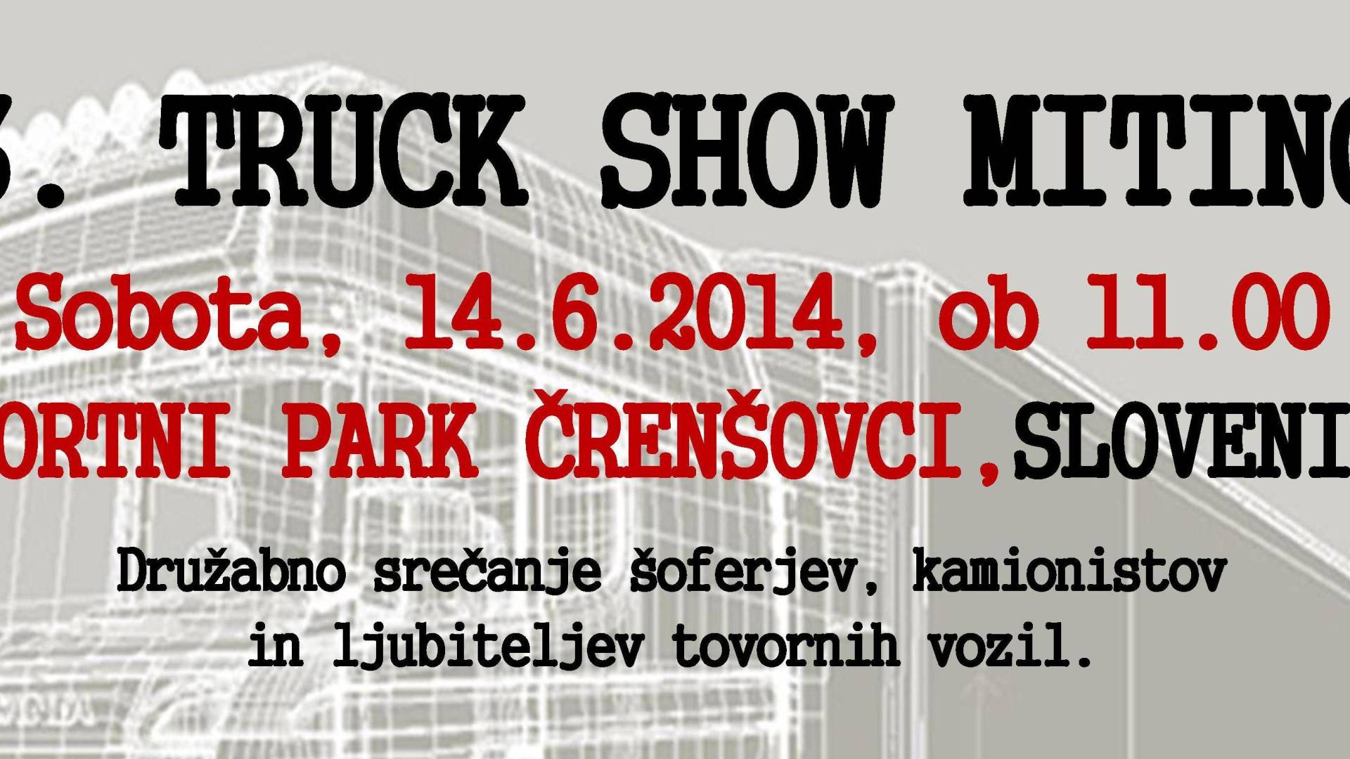 Športni park v ČrenšovcihNa pobudo stanovskih kolegov in lanskoletnega uspeha prvega srečanja, tudi letos organiziramo 3. TRUCK SHOW MITING, ki bo v soboto, 14.6.2014 s pričetkom ob 11.00 uri v Športnem parku v Črenšovcih.