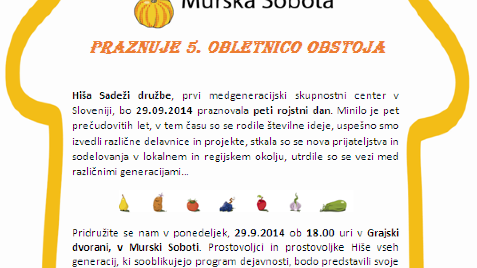Grajska dvorana Murska SobotaHiša Sadež Družbe, prvi medgeneracijski skupnostni center v Sloveniji, bo 29. septembra praznovala peti rojsni dan. Minilo je pet prečudovitih let, v tem času so se rodile številne ideje, uspešno smo izvedli različne delavnice in projekte, stklala so se nova prijateljstva in sodelovanja v lokalnem in regijskem okolju, utrdile so se vezi med različnimi generacijami ...