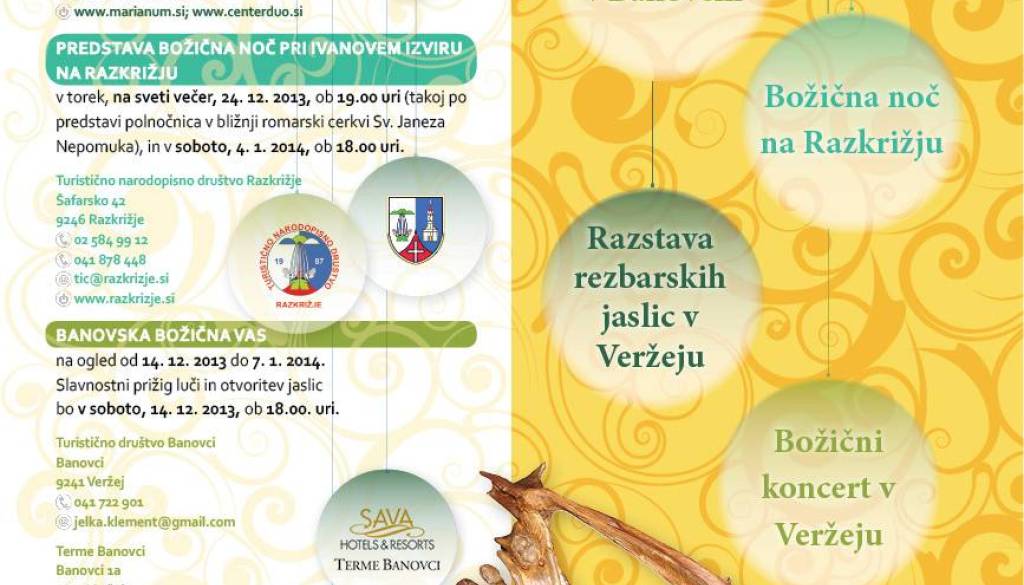 Zavod Marianum VeržejZ razstavo jaslic slovenskih rokodelcev, jasličarjev in otrok SV Slovenije od 06.12.2013 do 06.01.2014 vsak dan od 9:00 in 17:00 ure (tudi ob nedeljah in praznikih), od 07.01.2014 do 03.02.2014 ob delavnikih od 9:00 do 17:00 ure, ob sobotah ob 9:00 do 12:00 ure (ob nedeljah in praznikih po dogovoru).