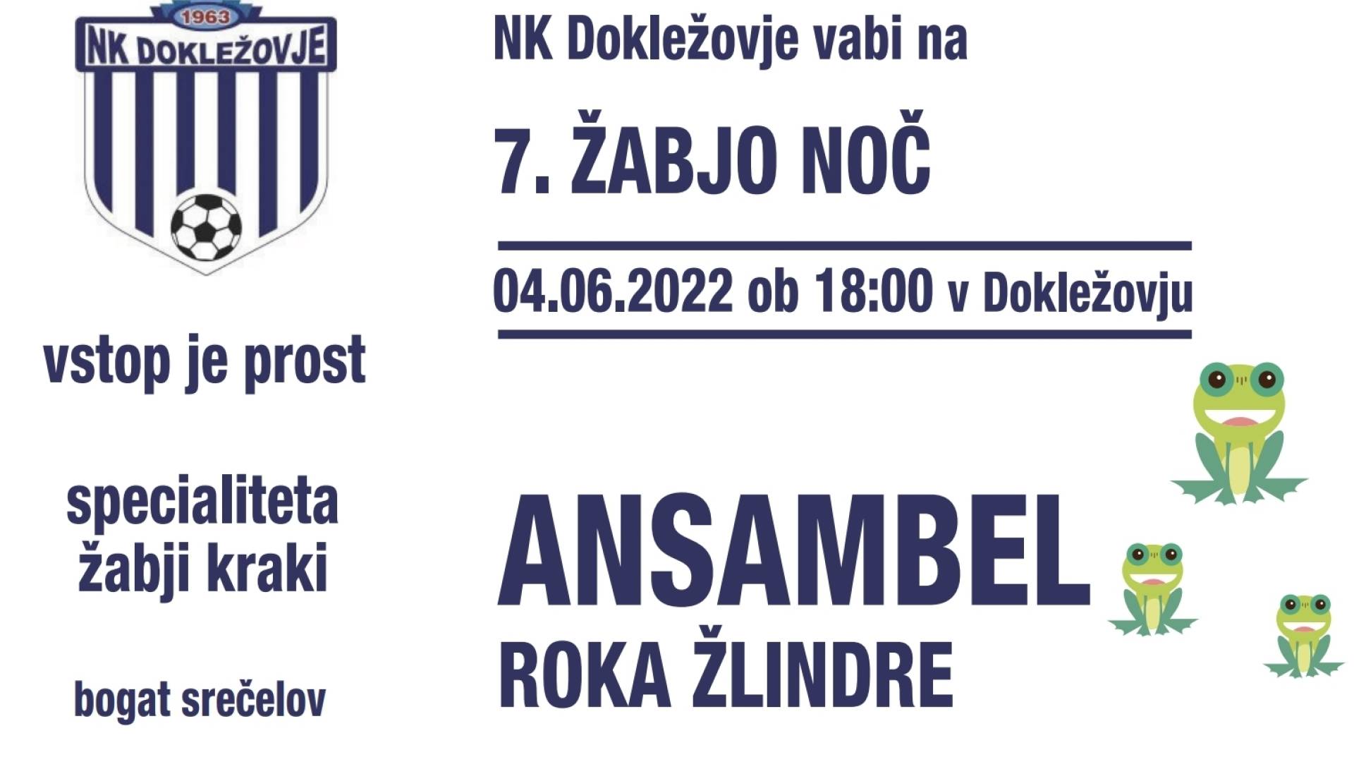 DOKLEŽOVJE PRI VAŠKO GASILSKEM DOMUVabljeni na tradicionalno žabjo noč, ki bo potekala pod velikim šotorom za vaško gasilskim domom v Dokležovju. Za glasbo bo poskrbel ansambel Roka Žlindre. Poskrbeli bomo da ne boste žejni in lačni. Čakala vas bo specialiteta žabji kraki. Pripravili bomo tudi bogat srečelov.