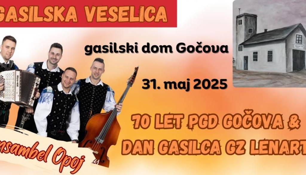 Pri gasilskem domu GočovaPGD Gočova prirejamo gasilsko veselico z ansamblom Opoj in bogatim srečelovom!