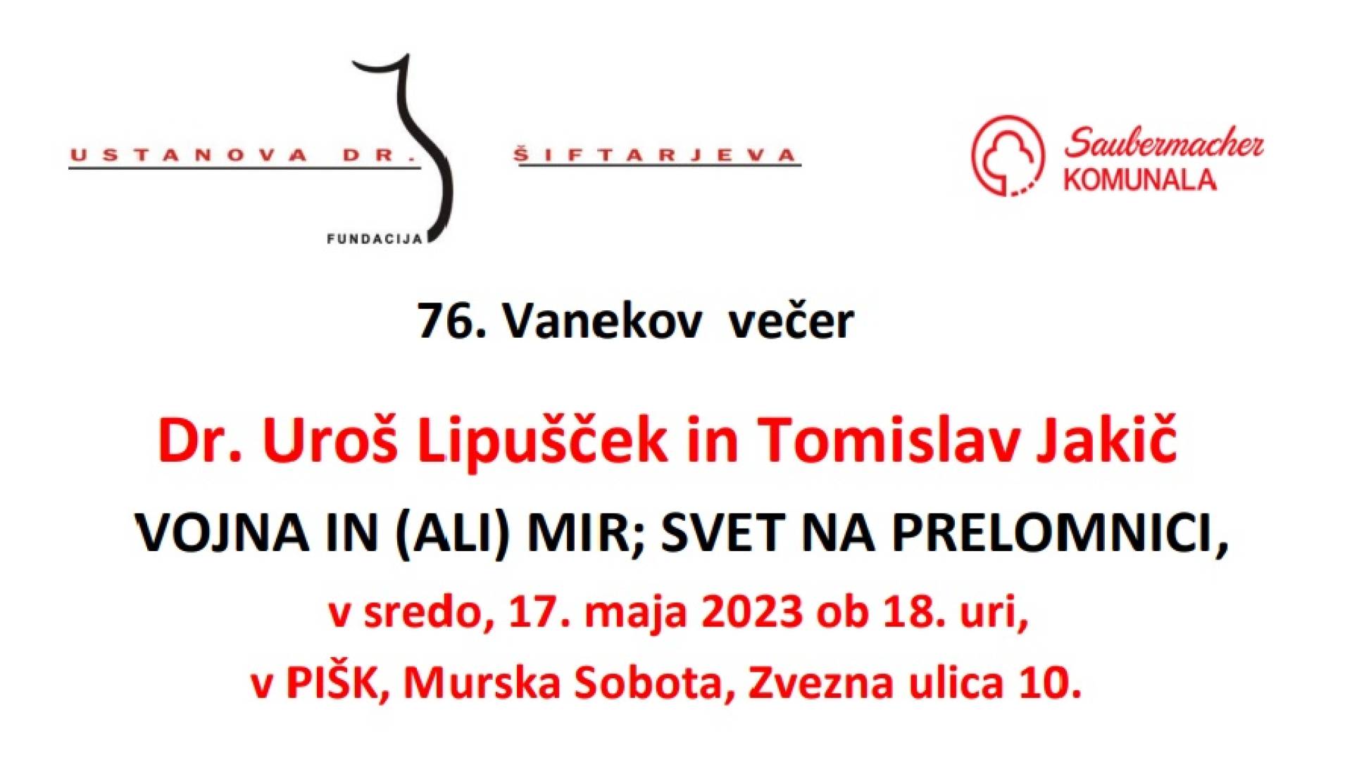 Dr. UROŠ LIPUŠČEK, dr. politoloških znanosti, dolgoletni dopisnik RTV Slovenija iz ZDA, urednik, svetovalec misije OVSE na Kosovu, rektor univerze AAB v Prištini, dopisnik Radia Slovenije na Kitajskem, član Programskega sveta Ustanove dr. Šiftarjeva fundacija, avtor več pomembnih in aktualnih monografij, nesporno eden najboljših poznavalcev Kitajske in celotnih mednarodnih razmer in angažiran ter kritičen analitik in komentator mednarodnih odnosov za več medijev, tudi v Prekmurju in že večkratni gost tudi Vanekovih večerov.