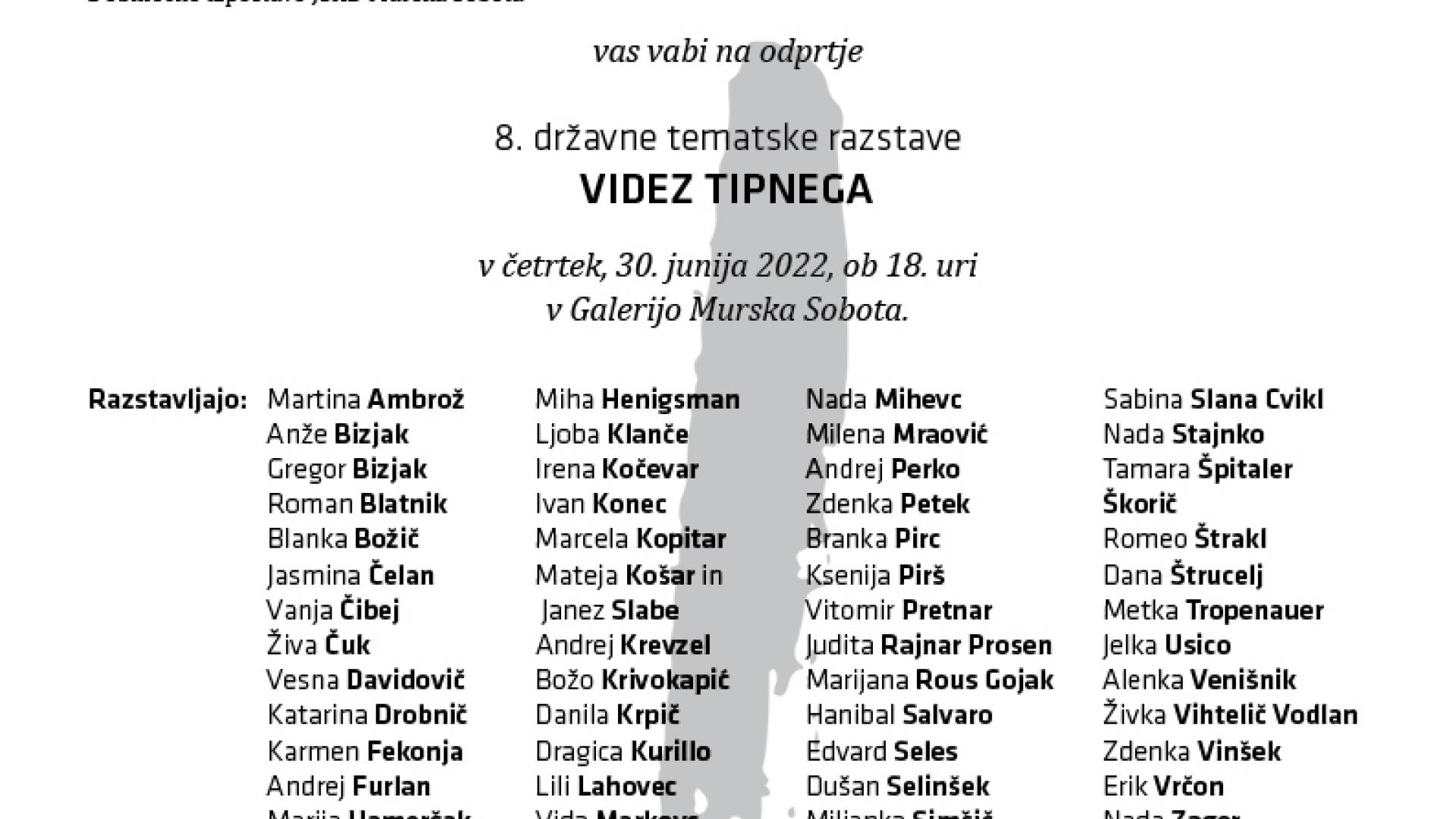 Galerija Murska SobotaV četrtek, 30. junija ob 18. uri, vljudno vabljeni v Galerijo Murska Sobota na otvoritev že 8. državne tematske razstave z naslovom Videz tipnega. Razstava, ki bo na ogled do 10. avgusta letos, je nastala v sodelovanju Javnega sklada RS za kulturne dejavnosti in Območne izpostave JSKD Murska Sobota.