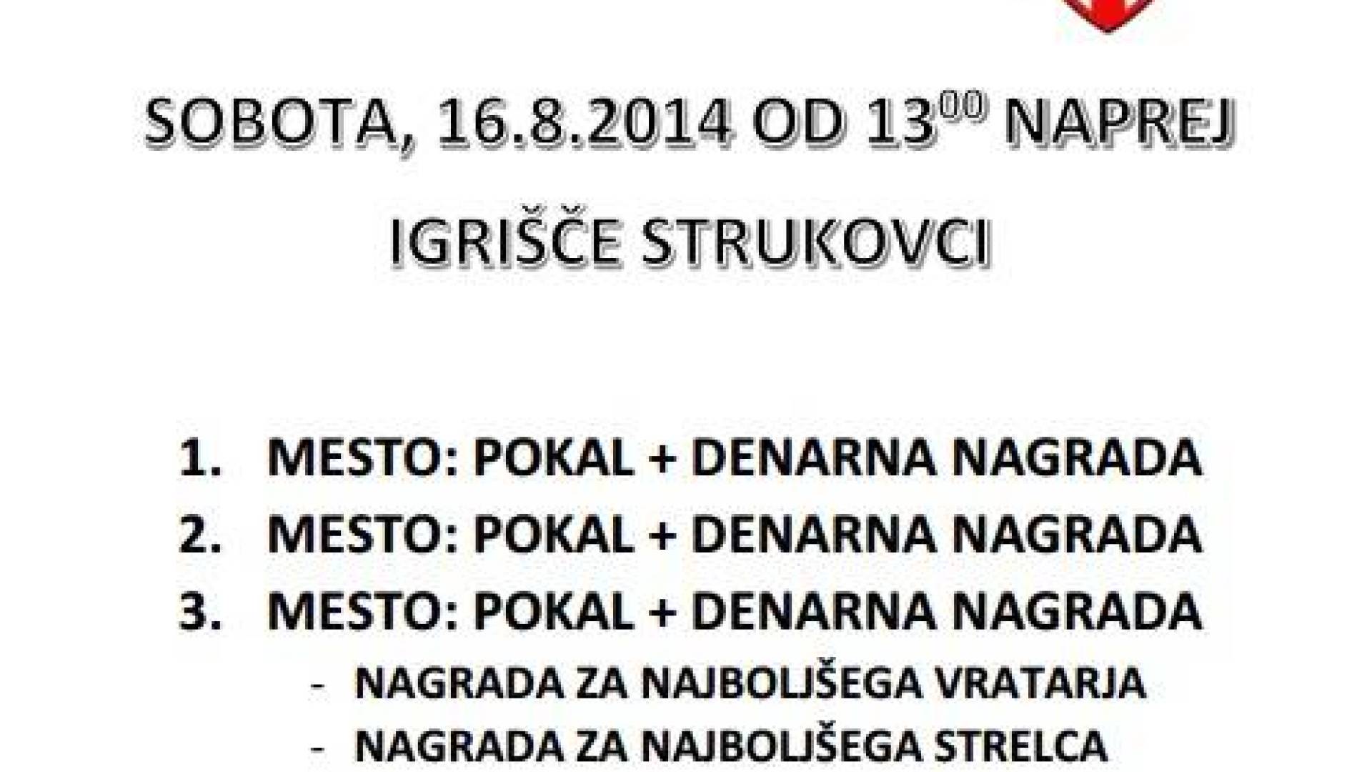 Prijavnina znaša 60 EUR. Žrebanje v petek 15.08. ob 20.00 uri na igrišču KMN Strukovci. Prijave: Denis, tel.: 041 339 537 in Viktor, tel.: 051 454 486.