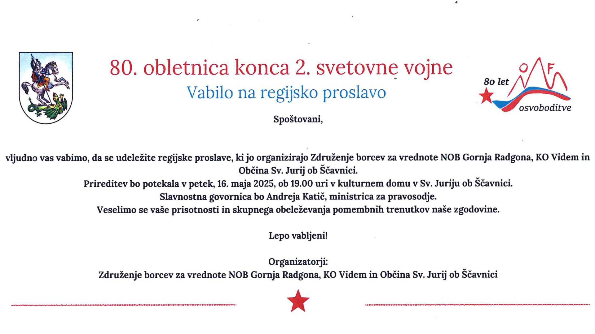 80. LETNICA KONCA 2. SVETOVNE VOJNE gregor1 | 16. maj 2025 12:15 v Kultura Termin Petek, 16. maj 2025 19:00 Lokacija Kulturni dom Sveti Jurij ob Ščavnici 80. LETNICA KONCA 2. SVETOVNE VOJNE