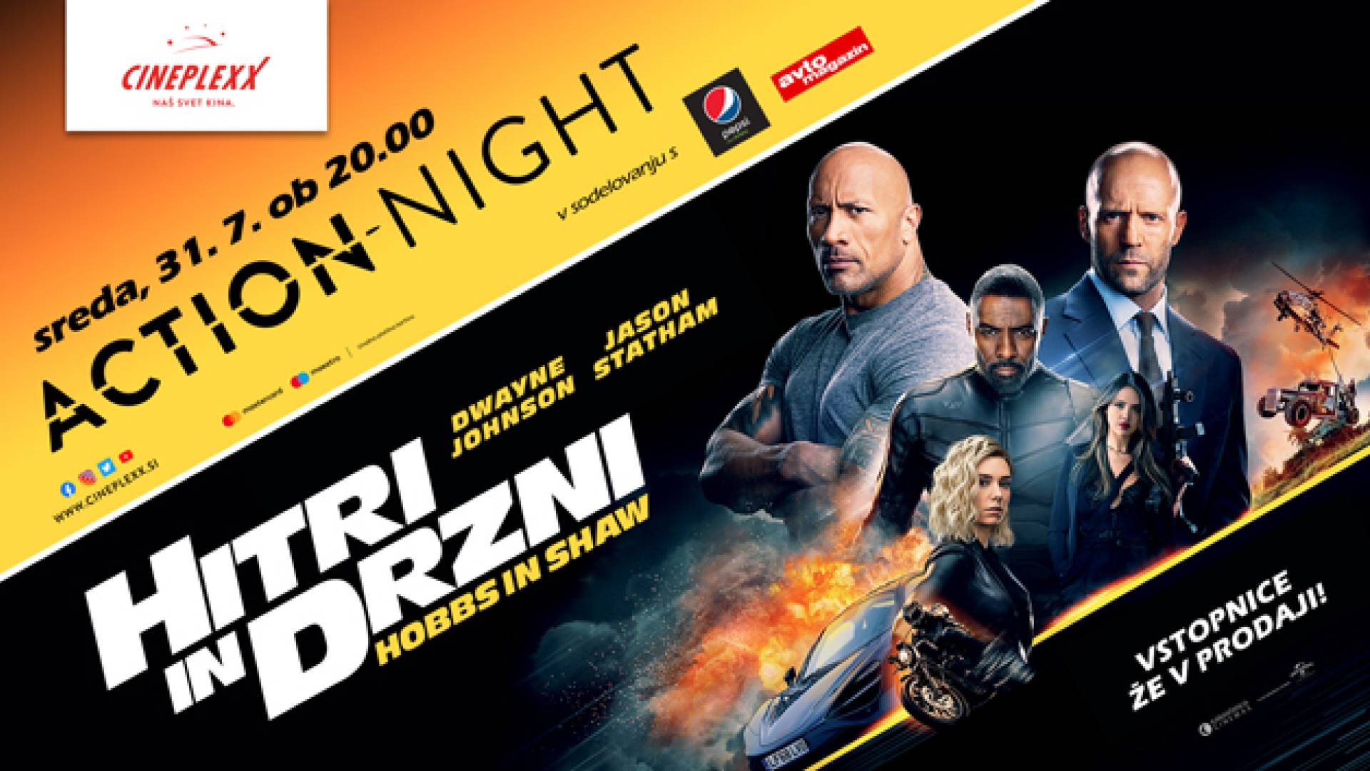 Vstopnice za Action night z akcijskim trilerjem HITRI IN DRZNI: HOBBS IN SHAW so že v prodaji. Obiskovalci se bodo razveselili nagradnega žrebanja in promocijskega izvoda revije Avtomagazin. Za osvežitev bo poskrbela Pepsi Max limeta.