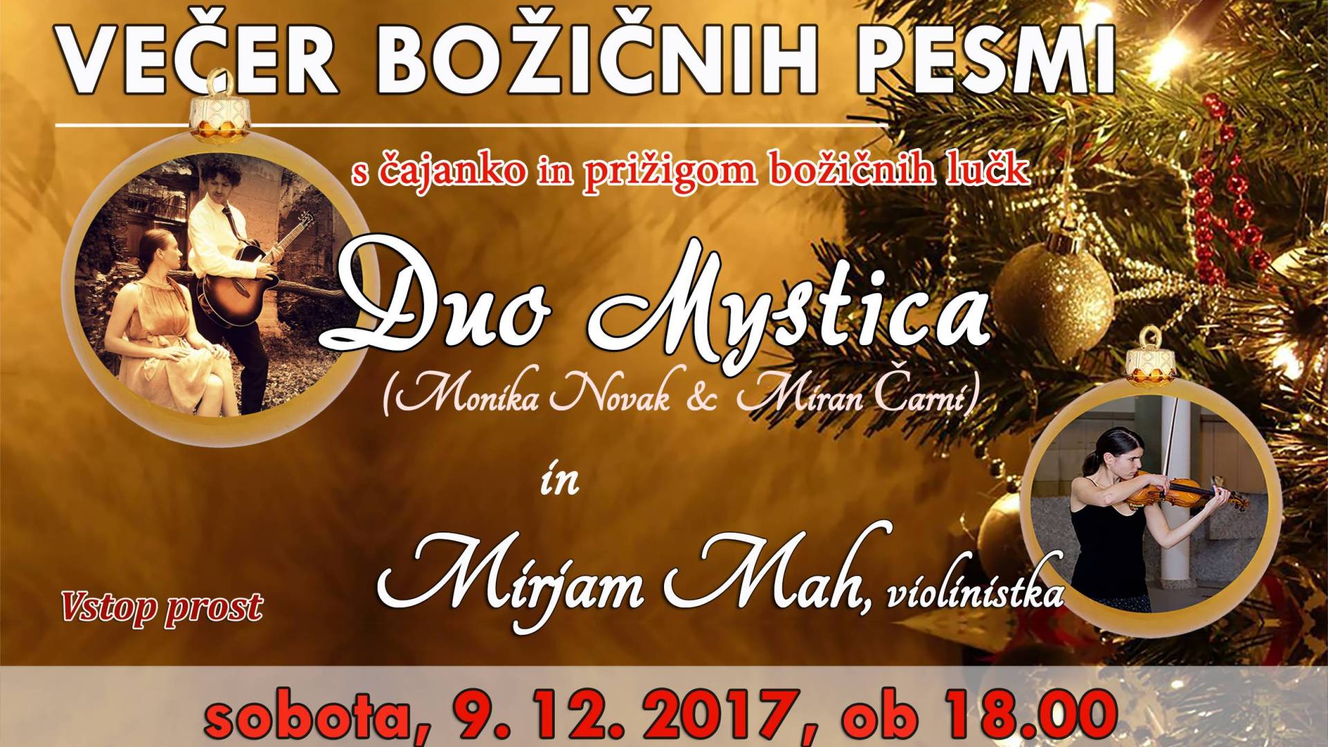 Duo Mystica (Monika Novak & Miran Čarni) in violinistka Mirjam Mah za vas pripravljajo poseben in praznično obarvan program, ki zajema vse od zimzelenih božičnih pesmi, tudi znanih filmskih melodij, do klasičnih božičnih skladb.