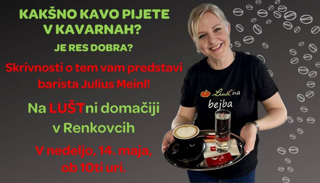 Luštna domačija RenkovciTo nedeljo, 14.5.2023, ob 10.00, pripravljamo na Luštni domačiji v Renkovcih izobraževalno degustacijski dogodek o tem, kakšna je pravilno in dobro pripravljena kava, na kaj moramo biti pozorni ob pitju kave in kako sploh razlikovati dobro in manj dobro kavo.