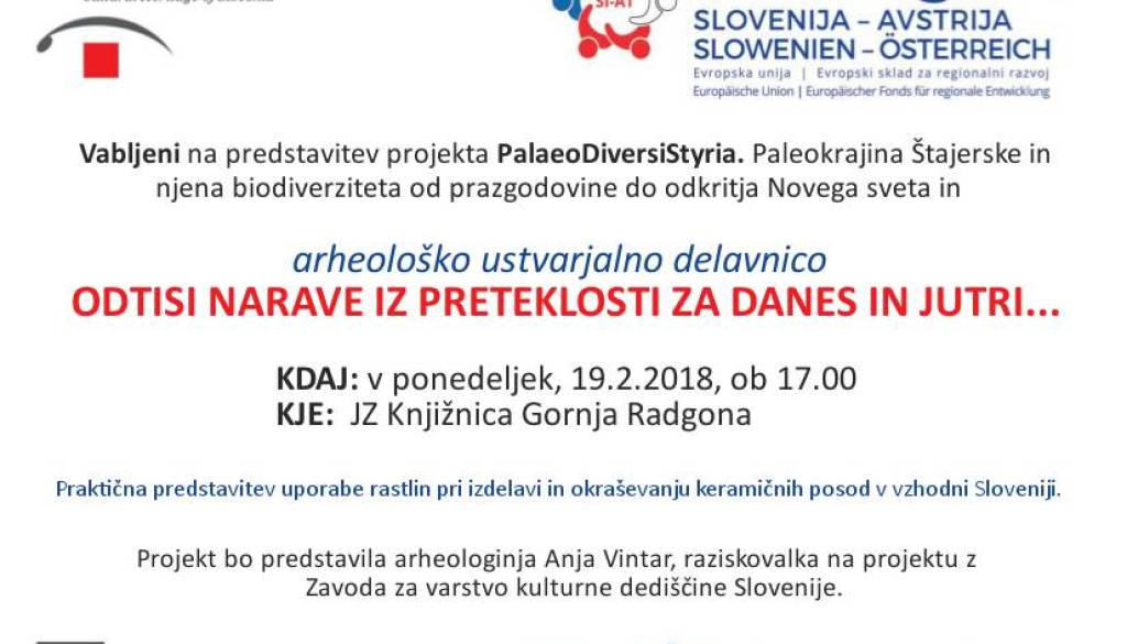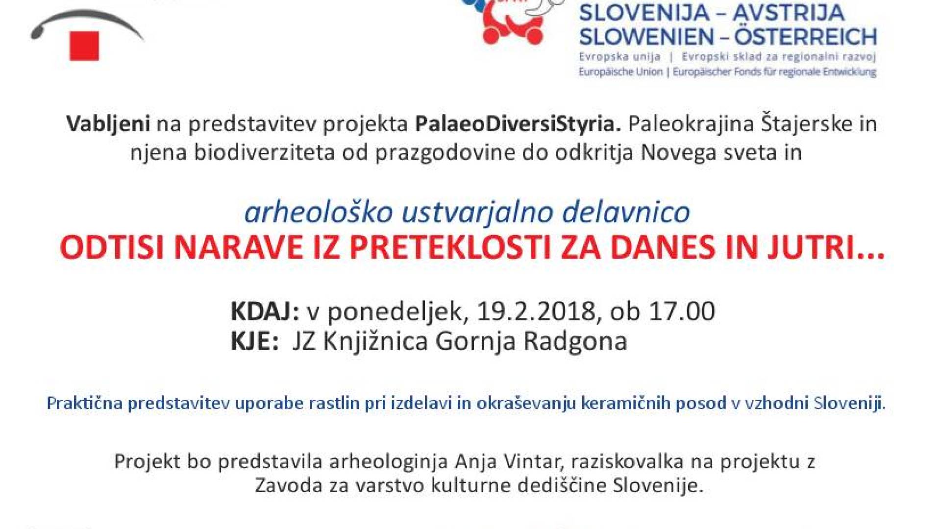 Knjižnica Gornja RadgonaVabljeni na predstavitev projekta PalaeoDiversiStyria. Paleokrajina Štajerske in njena biodiverziteta od prazgodovine do odkritja Novega sveta in arheološko ustvarjalno delavnico