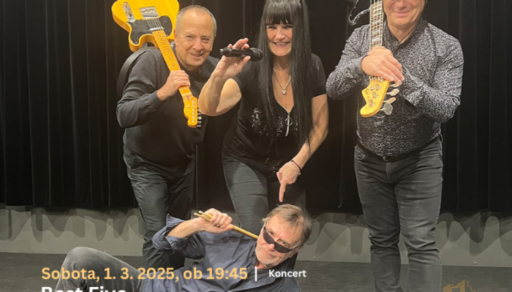 Vabimo vas, da se nam pridružite v soboto, 1. marca 2025, ob 19:45, v Zehnerhausu v Bad Radkersburgu, kjer bo nastopila skupina Best Five, petčlanska pop/rock zasedba z dolgoletnimi odrskimi izkušnjami.