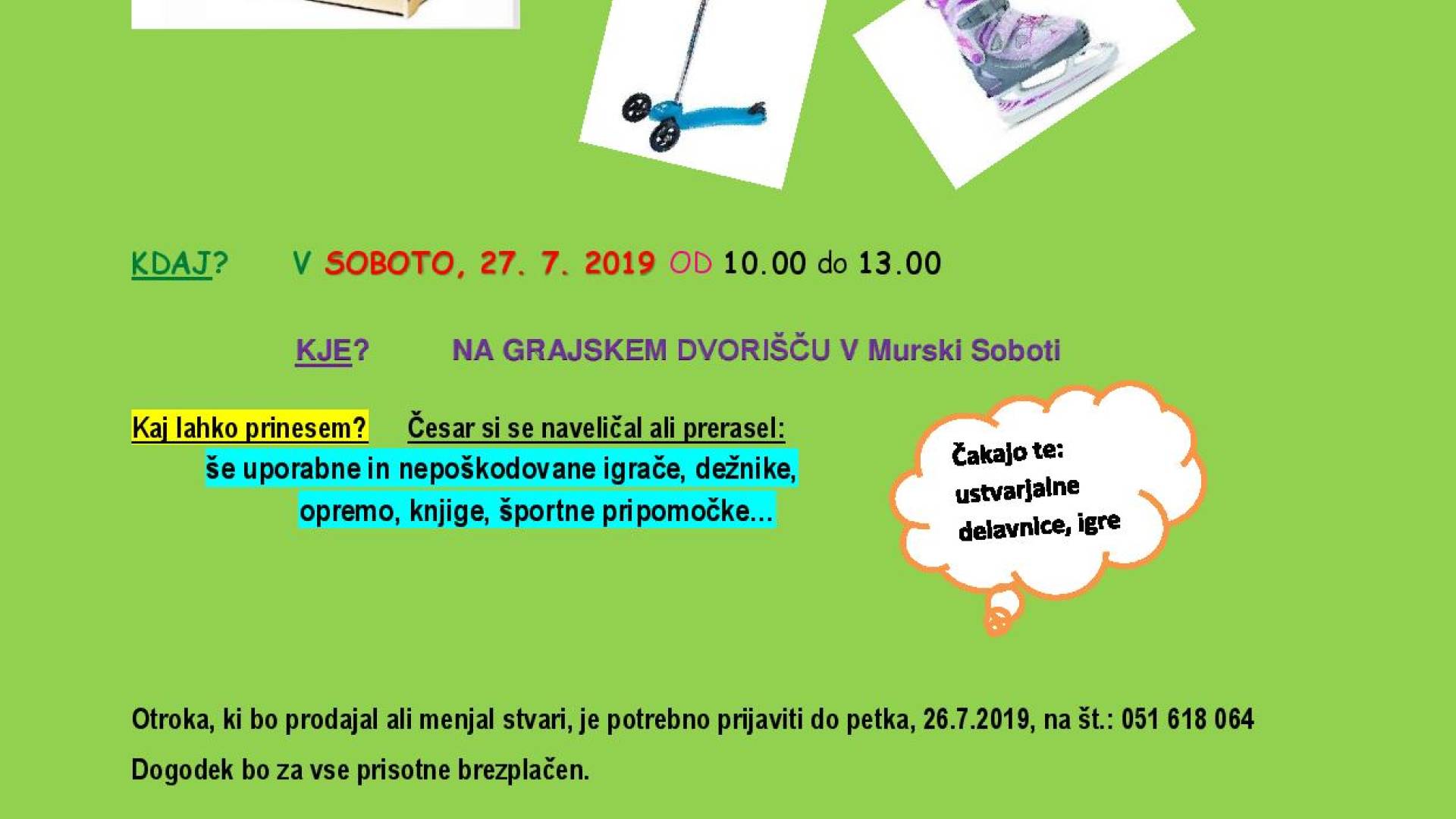 Zamenjajte, prodajte ali podarite že rabljene igrače! Igrače, oziroma stvari, ki jih več ne rabite, drugi otroci pa jih lahko še varno uporabijo.