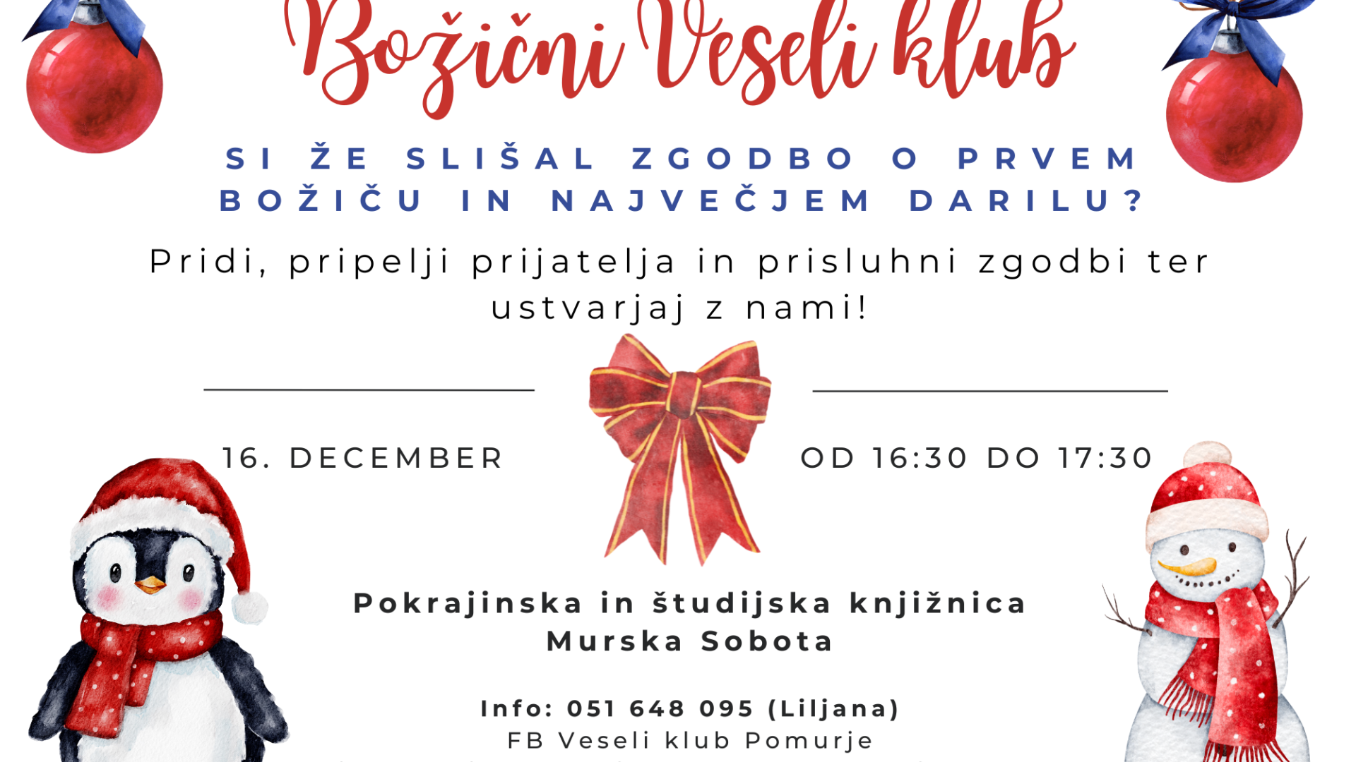 Pokrajinska in študijska knjižnica Murska Sobota Zvezna ulica 10 9000 Murska SobotaV torek, 16. 12. 2025 ob 16:30 vabimo otroke, stare od 5 do 12 let na praznično, ustvarjalno in veselo druženje. Na delavnici bomo prisluhnili navdihujoči zgodbi o prvem božiču, ustvarjali praznične izdelke, se igrali, smejali in preživeli prijeten čas v družbi vrstnikov.