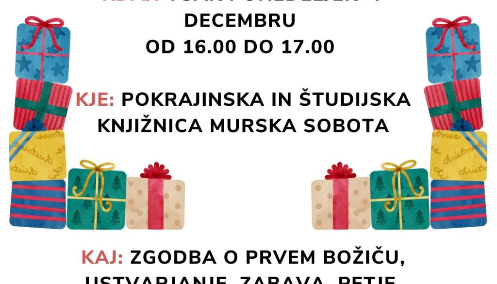 PIŠK MURSKA SOBOTAOtroci, stari od 5 do 12 let vabljeni na Božični Veseli klub, ki bo v ponedeljek, 5. 12. 2022 ob 16. uri v igralnici Pokrajinske in študijske knjižnice Murska Sobota. Prisluhnili bomo zgodbi o prvem božiču, peli in se zabavali. Tokrat bomo ustvarjali s sladkornimi palčkami.