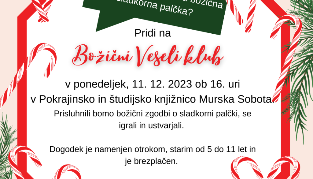 Pokrajinska in študijska knjižnica Murska Sobota Zvezna ulica 10 9000 Murska SobotaSi že slišal zgodbo o tem, kako je nastala božična sladkorna palčka? Nisi? Pridruži se nam v ponedeljek, 11. 12. 2023 ob 16h v prostorih PIŠK, prisluhni zanimivi zgodbi, ustvarjaj z nami in se zabavaj.