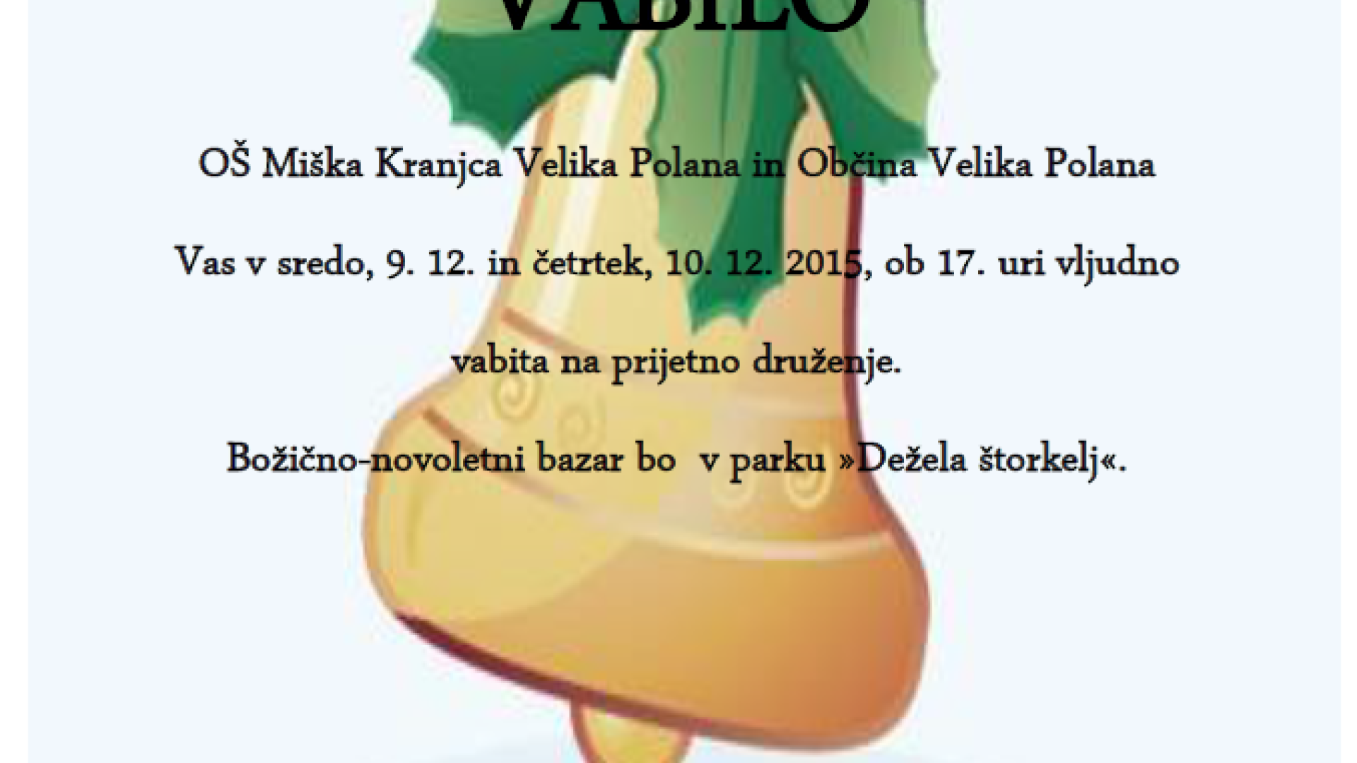 ParkOŠ Miška Kranjca Velika Polana in Občina Velika Polana vas vabita na Božično-novoletni bazar, ki se bo odvijal v parku "Dežela štorkelj" v Veliki Polani, v sredo, 9.12. in v četrtek, 10.12.2015 od 17. ure naprej. S programom se bodo predstavili otroci vrtca in šole.