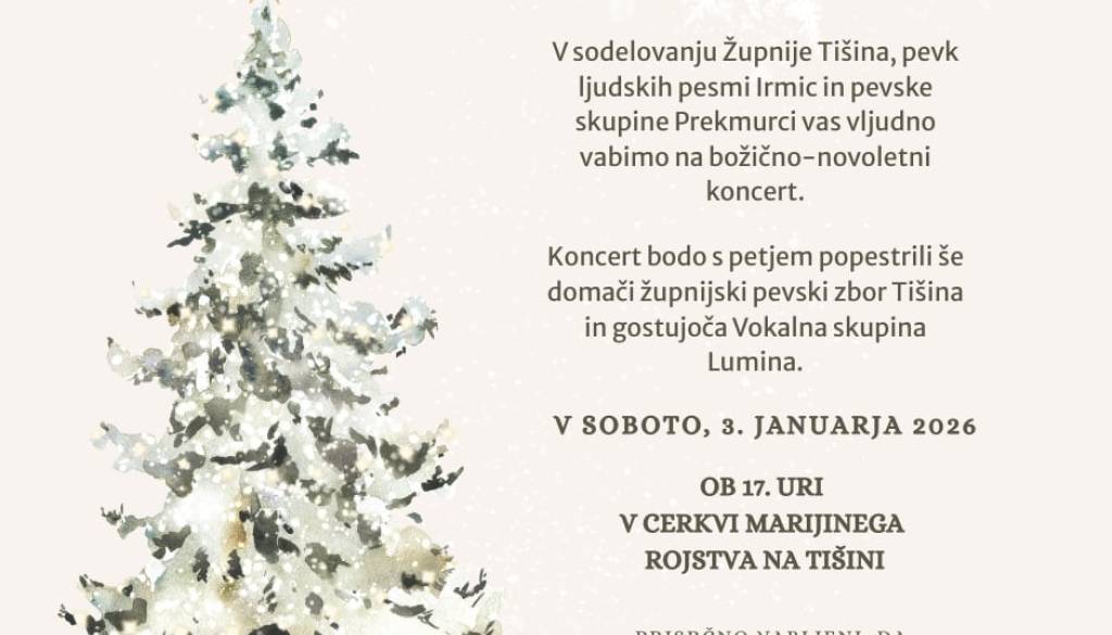Cerkev Marijinega rojstva na TišiniV sodelovanju Župnije Tišina, pevk ljudskih pesmi Irmic in pevske skupine Prekmurci vas vljudno vabimo na božično-novoletni koncert, ki bo potekal v cerkvi na Tišini, v soboto, 3. januarja 2026 ob 17. uri.