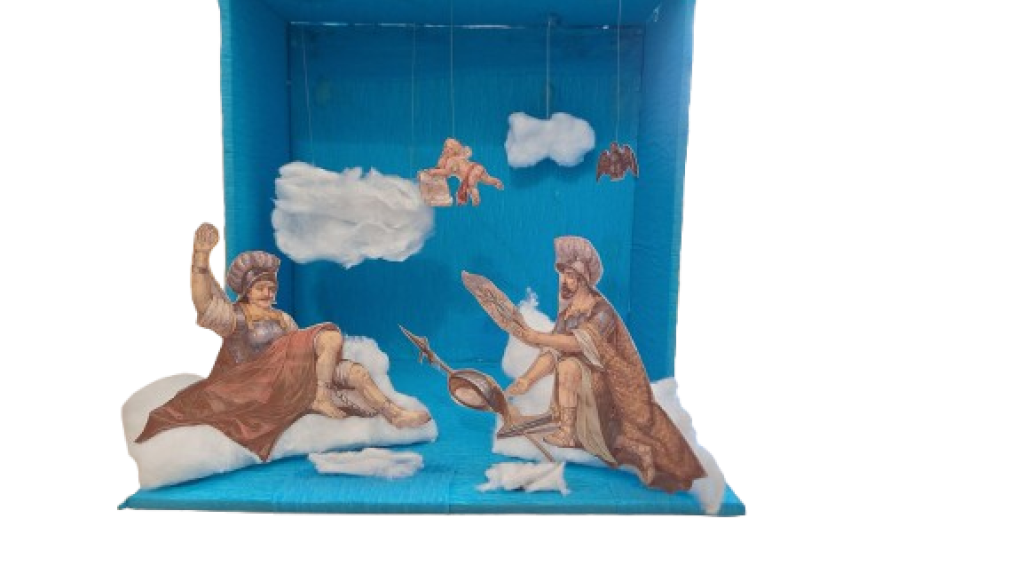 V baročnem salonu murskosoboškega gradu si bomo najprej ogledali zanimivo poslikavo stropa, na katerem so na nebu naslikani bogovi iz antične mitologije, ki jih obdajajo majhni krilati otroci. Spoznali bomo njen pomen, nato pa izdelali dioramo. Udeleženci boste prejeli modro škatlo, v katero boste umeščali motive iz stropne poslikave, ki bodo z malo domišljije zaživeli.