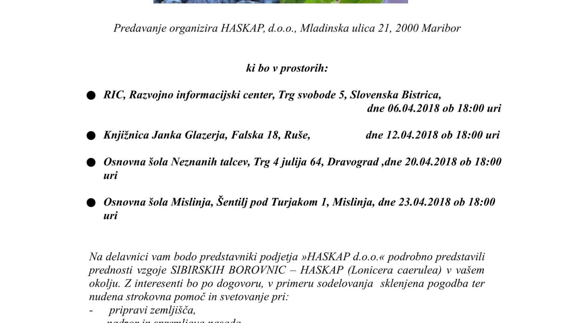 Brezplačno predavanje - PRIDELAVA SIBIRSKIH BOROVNIC - ODKUP ZAGOTOVLJEN Haskap Sibirska borovnica | 30. marec 2018 10:40 v Termin Petek, 6. april 2018 10:38 - Ponedeljek, 23. april 2018 10:38 Lokacija ZA VEČ INFO POKLIČITE 068 155 388.