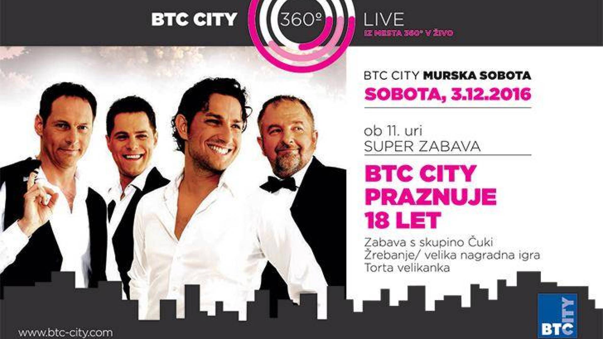 BTC City Murska Sobota praznuje 18. rojstni dan! Ob tej priložnosti vam pripravljamo SUPER ZABAVO s skupino Čuki. Izžrebali bomo nagrajence velike nagradne igre, manjkala pa ne bo niti torta velikanka.