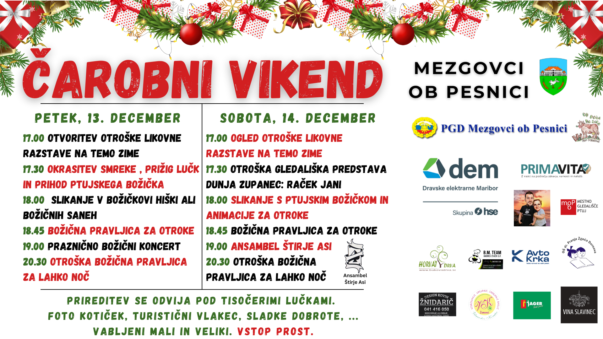 PGD Mezgovci ob Pesnici, Mezgovci ob Pesnici 38, 2252 DornavaPGD Mezgovci ob Pesnici vabi na pravljični Čarobni vikend v Mezgovcih ob Pesnici, ki bo potekal v petek, 13. decembra, in v soboto, 14. decembra 2024. Dogodek, ki je namenjen obiskovalcem vseh starosti, bo s pestrim programom pričaral pravo praznično vzdušje in obiskovalcem omogočil brezplačne aktivnosti v soju tisočerih prazničnih lučk.