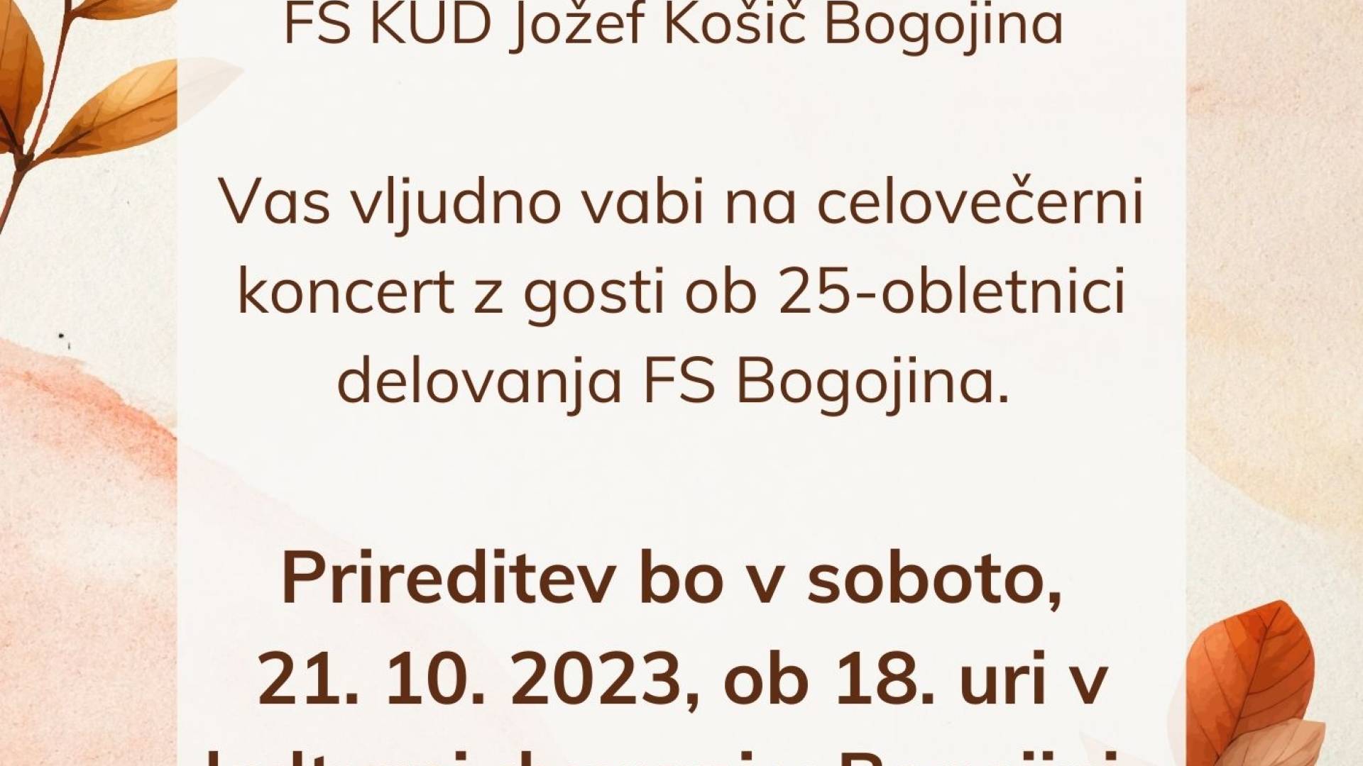 Ob tej jubilejni priložnosti bo v soboto, 21. 10. 2023 ob 18. uri v kulturni dvorani v Bogojini celovečerni koncert