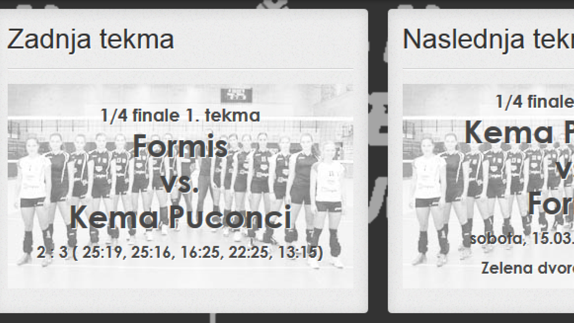 Zelena dvorana PuconciIgralke Keme so na prvi četrtfinalni tekmi po dramatičnem zaključku s 3:2 premagale igralke Formisa, ter povedle s 1:0 v zmagah. Morebitna sobotna zmaga bi že pomenila uvrstitev v polfinale državnega prvenstva, kar bi bil nedvomno največji uspeh ekipe iz Puconec, zato ste vsi vabljeni, da do zadnjega kotička napolnite Zeleno dvorano!