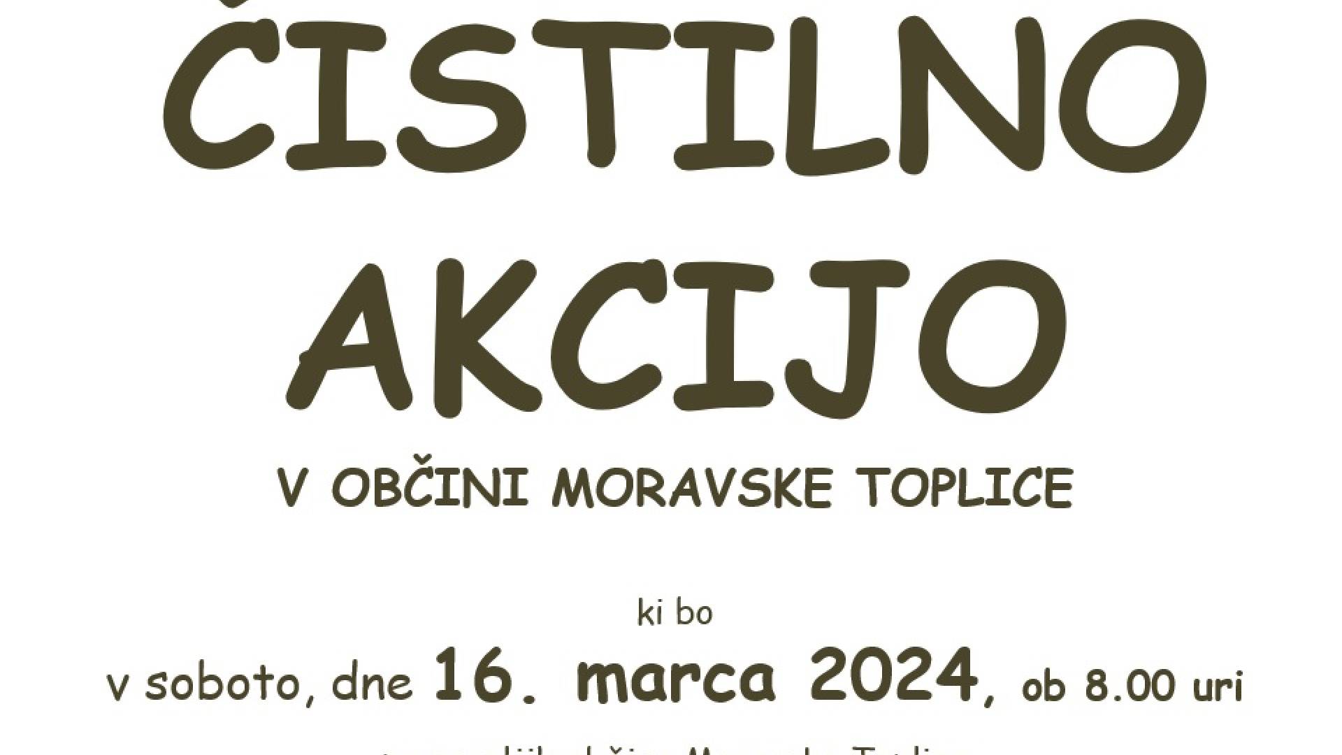 Občina Moravske TopliceTradicionalna čistilna akcija občine Moravske Toplice bo v soboto, 16. marca 2024, od 8.00 do 12.00 ure .