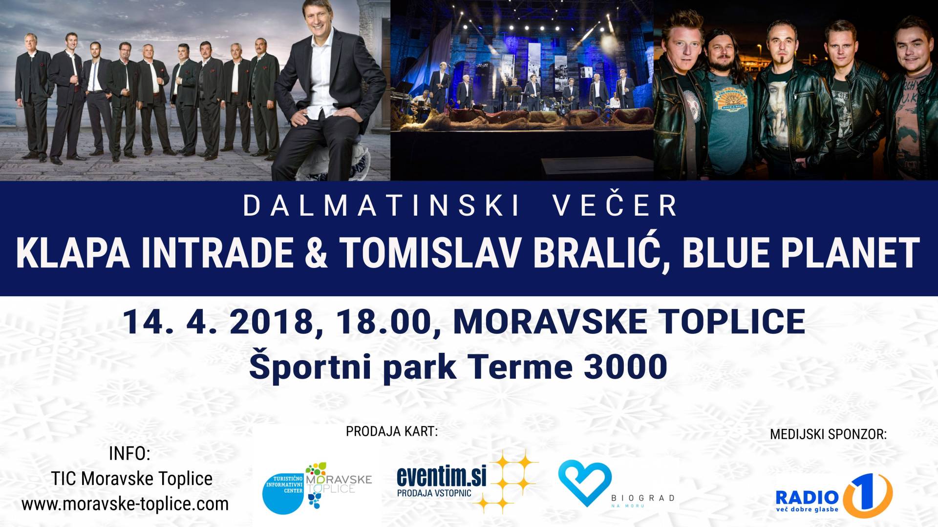 Moravske Toplice, centerNa ta aprilski večer boste lahko uživali ob zvokih Klape Intrade & Tomislava Bralića in skupine Blue Planet, zraven pa razvajali svoje brbončice ob dalmatinski specialiteti.