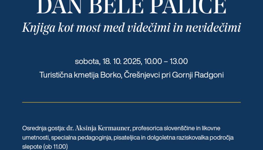 Turistična kmetija BorkoLions klub Gornja Radgona vabi na Dan bele palice. Knjiga – most med videčimi in nevidečimi, ki bo v soboto, 18. oktobra 2025, med 10. in 13. uro potekal na Turistični kmetiji Borko v Črešnjevcih pri Gornji Radgoni.