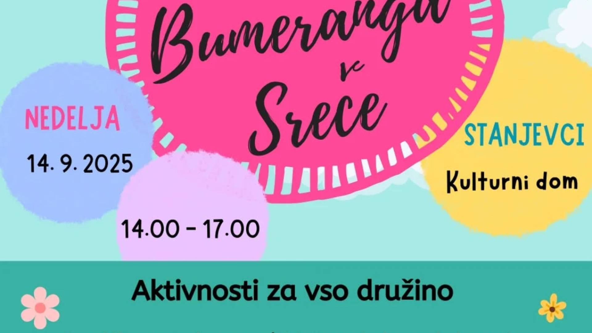 Kulturni dom StanjevciV nedeljo, 14. septembra bomo z Društvom Bumerang Sreče organizirali dogodek - Dan Bumeranga Sreče. Prosimo, če lahko spodnje besedilo in letak objavite v vašem koledarju dogodkov.