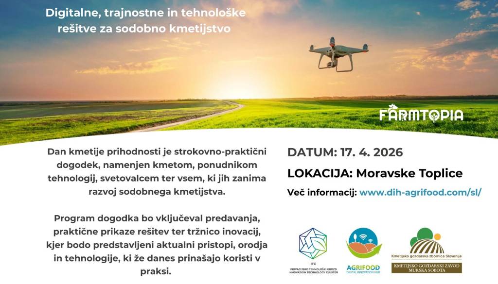 Kranjčeva ulica 49, Moravske TopliceKako bo videti kmetija prihodnosti – in kaj od tega lahko na svoji kmetiji uporabite že danes? Vabimo vas na Dan kmetije prihodnosti, kjer bomo skozi srečanje kmetov, strokovnjakov in raziskovalcev odkrivali nove pristope, tehnologije ter priložnosti za razvoj sodobnega kmetijstva.