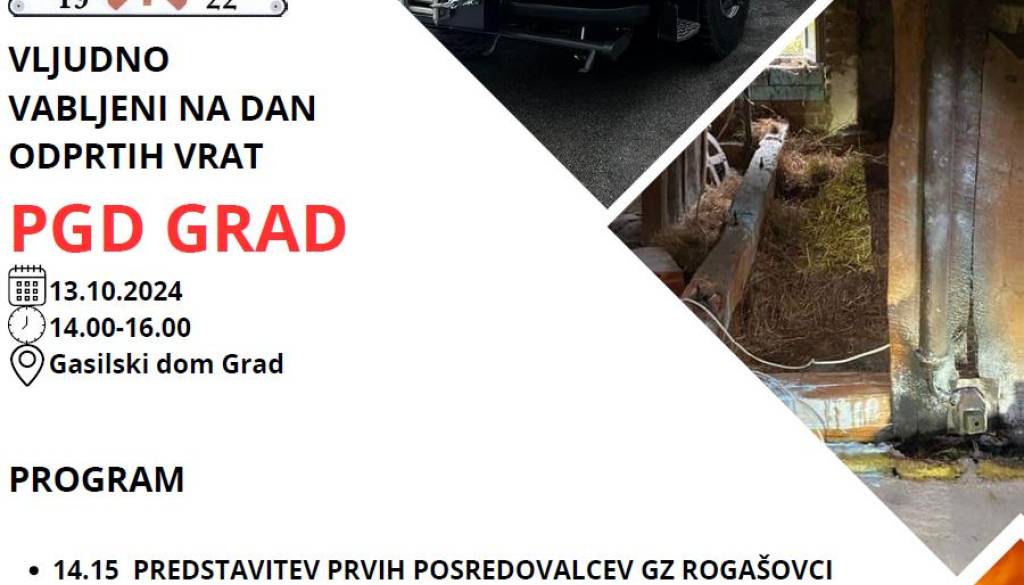 Dan odprtih vrat PGD Grad Jana Bohar | 10. oktober 2024 12:21 v Zabava Termin Nedelja, 13. oktober 2024 14:00 - Nedelja, 13. oktober 2024 16:00 Lokacija Gasilski dom GRAD Vabljeni!