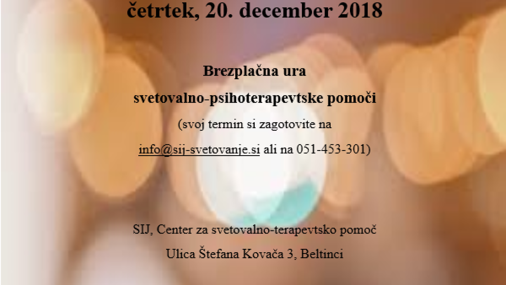 SIJ, Center za svetovalno-terapevtsko pomoč, Ulica Štefana Kovača 3, BeltinciBliža se najlepši čas v letu, čas obdarovanj. Zato smo se v centru SIJ odločili, da bomo odprli vrata naše pisarne vsem tistim, ki ste v stiski in že dolgo zbirate pogum, da bi videli, kako poteka ura psihoterapevtske pomoči (posamezniki, zakonci/pari, družine, otroci). Za vas smo pripravili dan odprtih vrat, ki bo v četrtek, 20. 12. 2018. Svojo BREZPLAČNO uro svetovalno-psihoterapevtske pomoči si zagotovite na [email protected] ali na 051-453-301.
