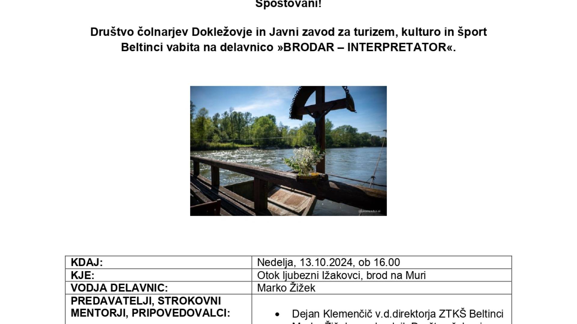 Otok ljubezni IžakovciDruštvo čolnarjev Dokležovje in Javni zavod za turizem, kulturo in šport Beltinci vabita na delavnico »BRODAR – INTERPRETATOR«, ki bo v nedeljo, 13. 10. 2024 na Otoku ljubezni, na brodu na Muri. Delavnico bo vodil Marko Žižek, moderirala pa jo bo Nataša Hartman Adjei.