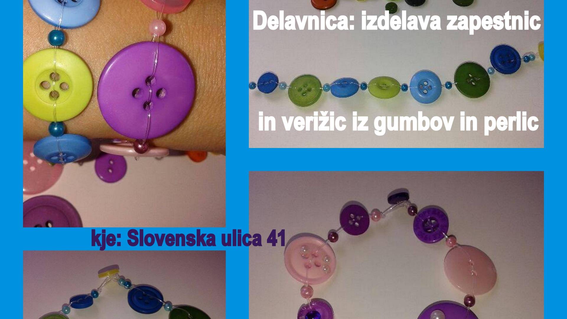 V prostorih gledališkega društva PISANI MEHURČKI Slovenska ulica 41Izdelovali bomo pisane verižice in zapestnice iz gumbov in perlic. Vabljeni otroci vseh starosti.