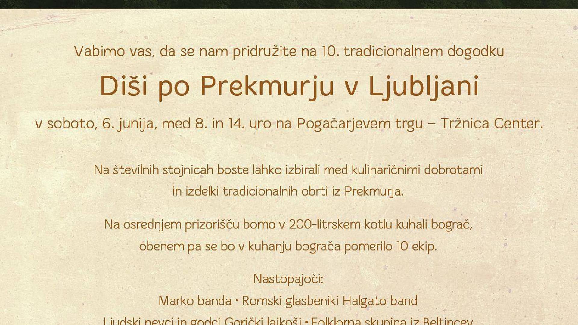 Pogačarjev Trg LjubljanaTradicionalna etnološko kulinarična prireditev »Diši po Prekmurju« se bo odvijala 6. junija 2015 na glavni ljubljanski tržnici, na Pogačarjevem trgu. Dogodek je edinstvena predstavitev Prekmurja, regije odlične kulinarike, ohranjanja tradicije, naravnih lepot ter prijaznih in gostoljubnih ljudi.