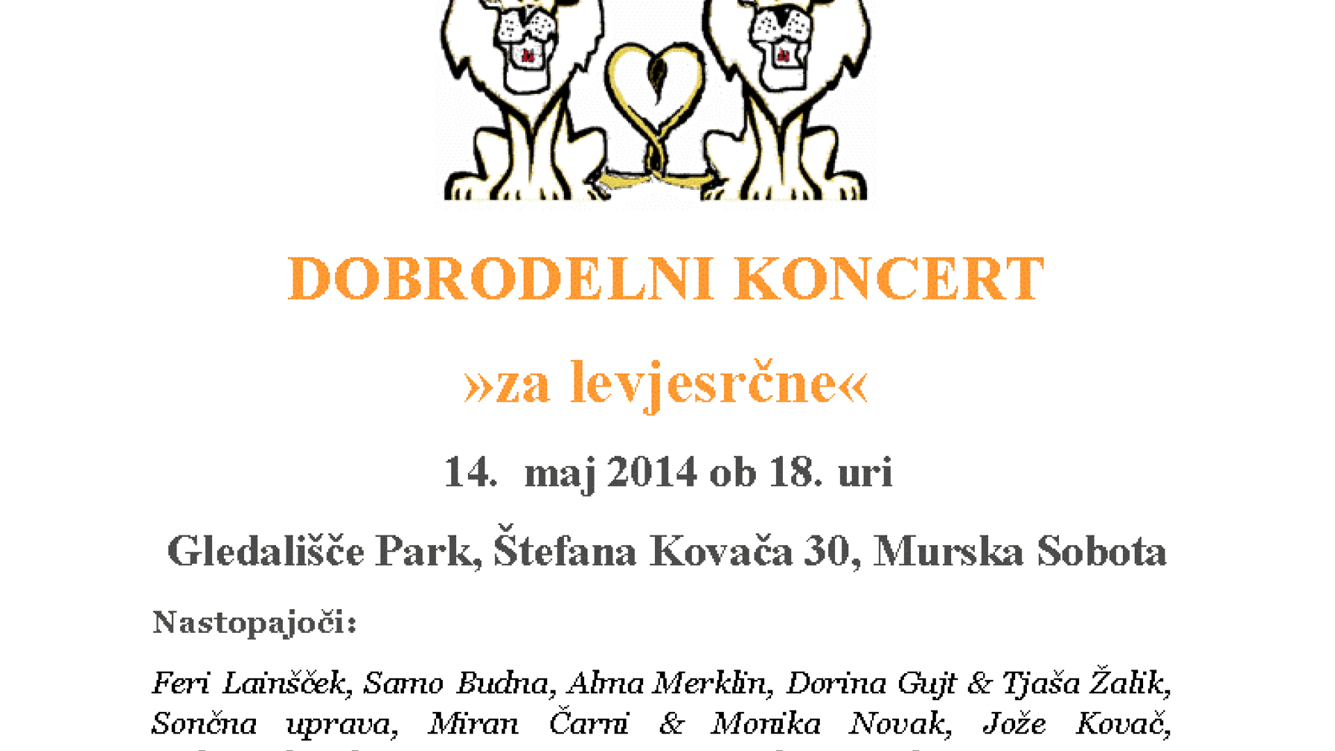 Vljudno vabljeni na Dobrodelni koncert "za levjesrčne", ki bo v sredo 14. maja 2014 ob 18. uri.