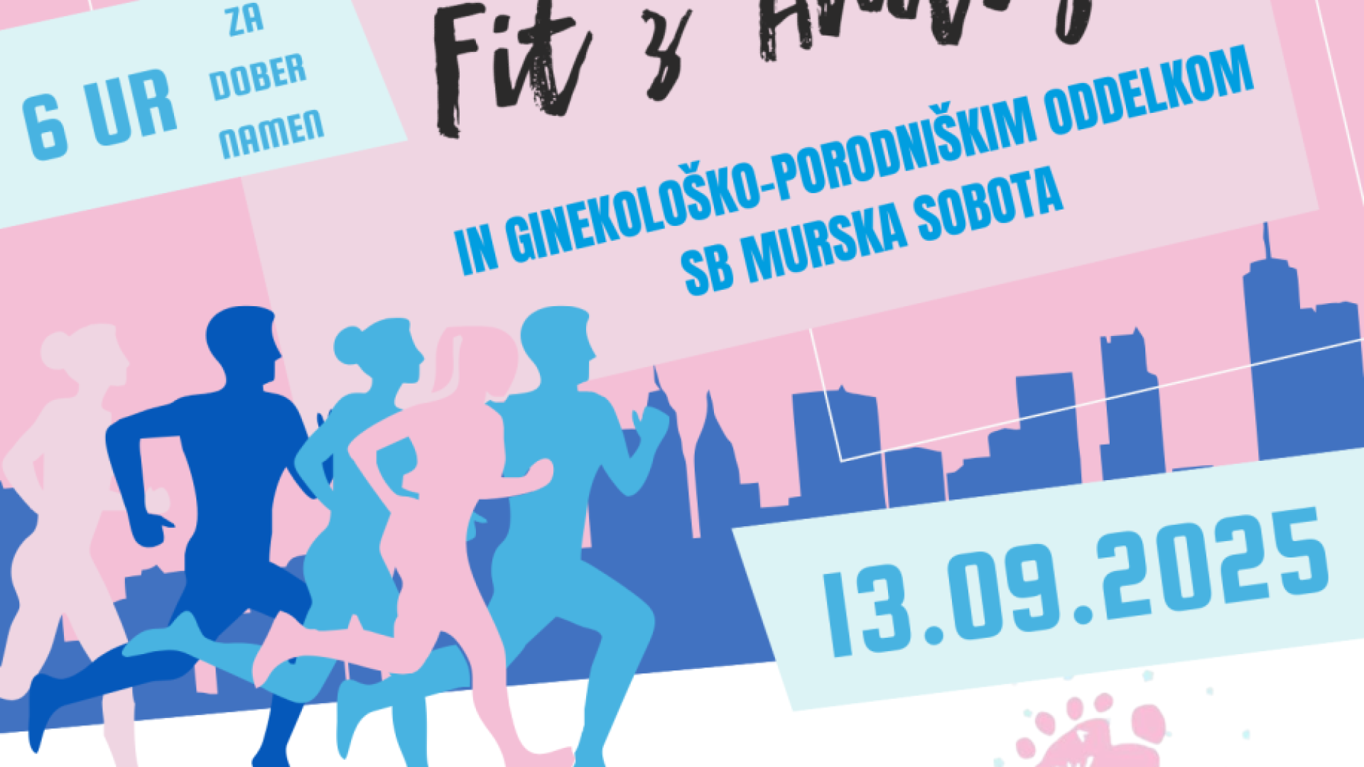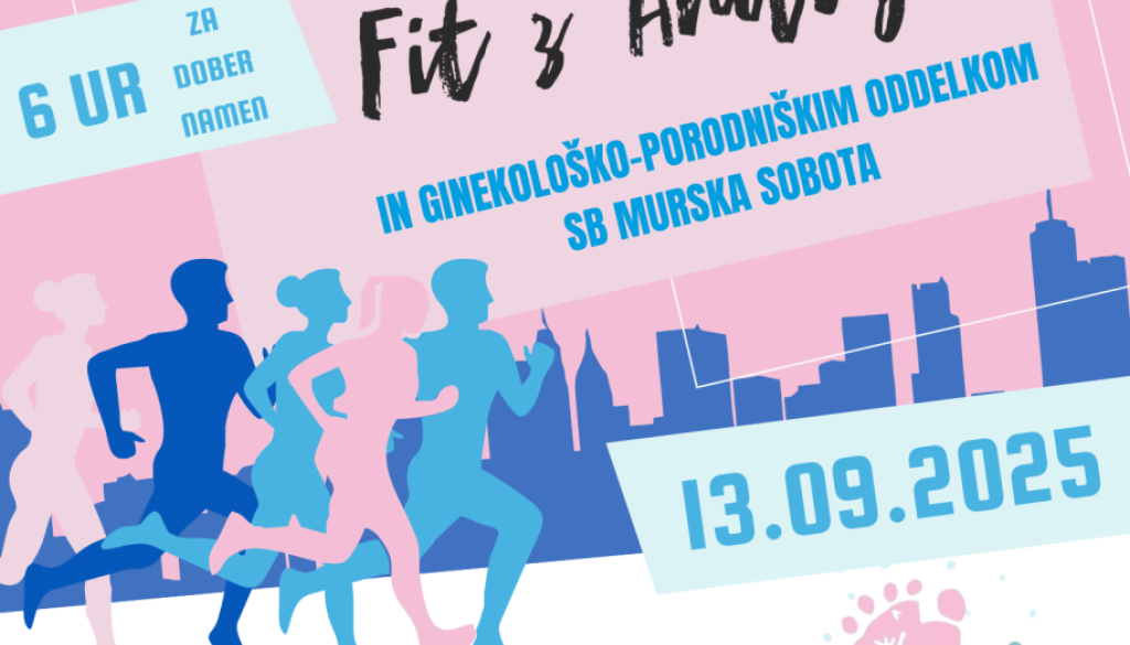Atletski šolski stadion OŠ I Murska Sobota6 UR ZA DOBER NAMEN Skupaj zbirajmo kroge za dober namen Spoštovani, v soboto, 13. septembra 2025, bomo na atletskem stadionu OŠ I Murska Sobota pripravili dobrodelni tek “6 ur za dober namen”. Dogodek organiziramo v sodelovanju s FIT time - Fit z Andrejo, ki že vrsto let s svojim zgledom spodbuja gibanje, zdrav življenjski slog in medsebojno pomoč. Verjamemo, da vsak korak šteje – ne le za zdravje posameznika, temveč tudi za dobro skupnosti. Pridružimo se Andreji, ki bo na stadionu 6 ur premagovala kroge za dober namen, in s tem povezala gibanje, solidarnost in srčnost. Vabimo vas, da se nam pridružite - peš, s kolesom, z vozičkom, s kužkom ali zgolj s prisotnostjo. Veseli bomo, če naša prizadevanja nagradite z dobrodelno donacijo, ki bo porabljena namensko za nakup medicinske opreme za ginekološko-porodniški oddelek Splošne bolnišnice Murska Sobota.